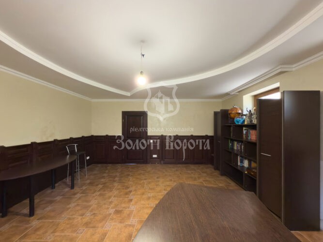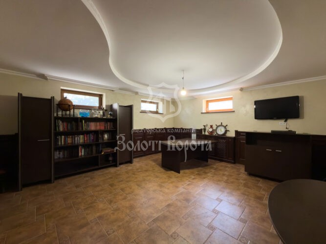 У цокольному поверсі розміщено два великі кабінети (30 та 37 м2), приміщення під сауну, санвузол, котельню з двоконтурним газовим котлом та твердопаливною системою, бойлер на 1000 літрів, пральню та технічні кімнати. Простір цього рівня може використовуватись як повноцінне укриття.