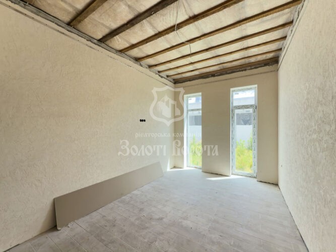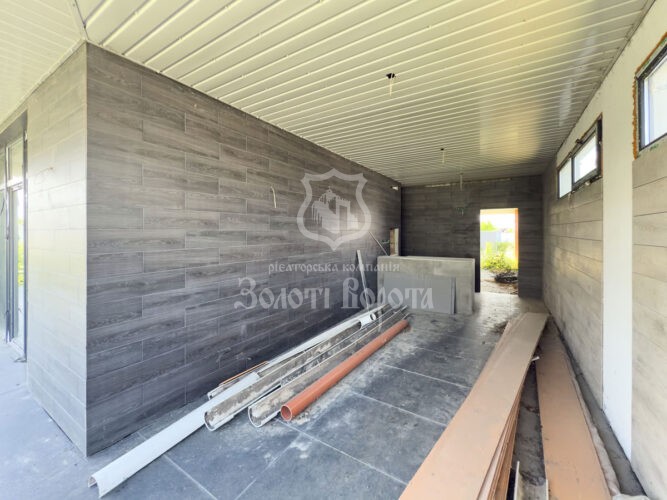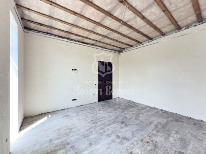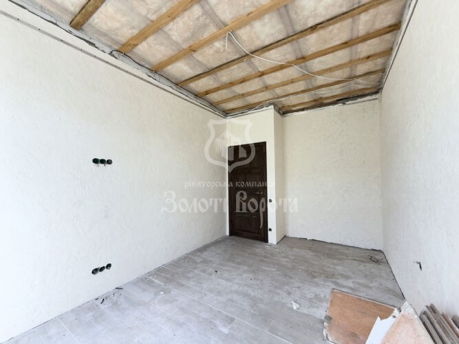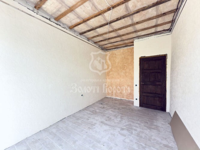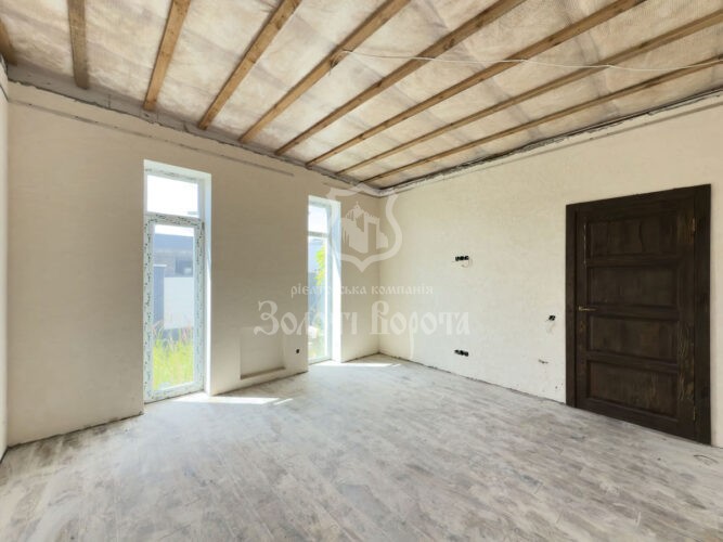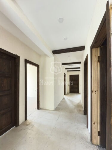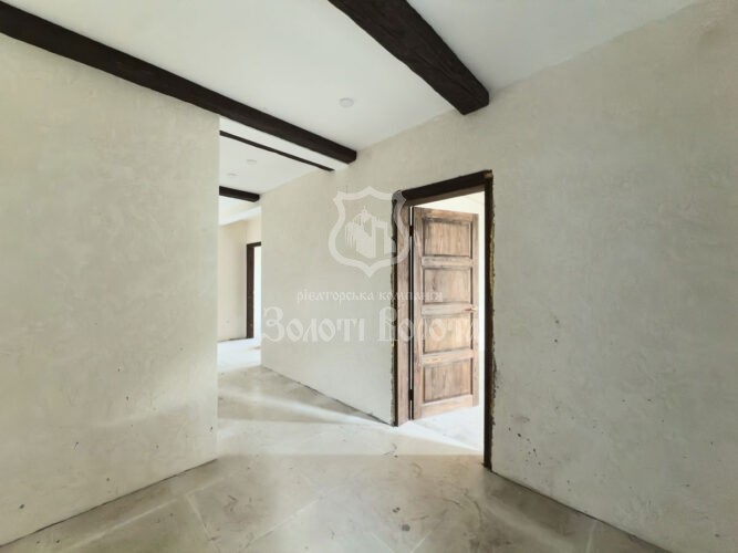 Двері в будинку виконані з натурального дерева, що додає інтер’єру затишку. Будинок теплий, а поруч вже живуть сусіди, створюючи дружню атмосферу.