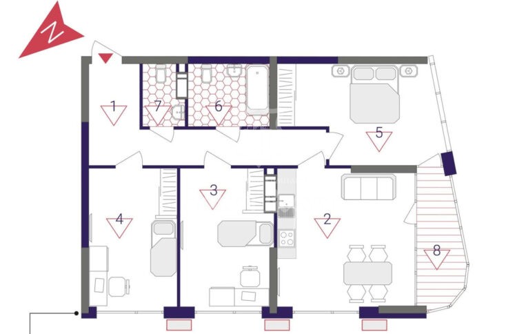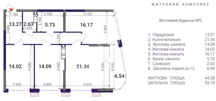 Загальна площа — 94 м2, житлова — 45 м2, кухня-вітальня — 21 м2, окремо лоджія площею 6,5 м2. У квартирі три ізольовані кімнати — простір, який дозволяє створити комфортне сімейне гніздо або втілити власний дизайнерський проєкт.