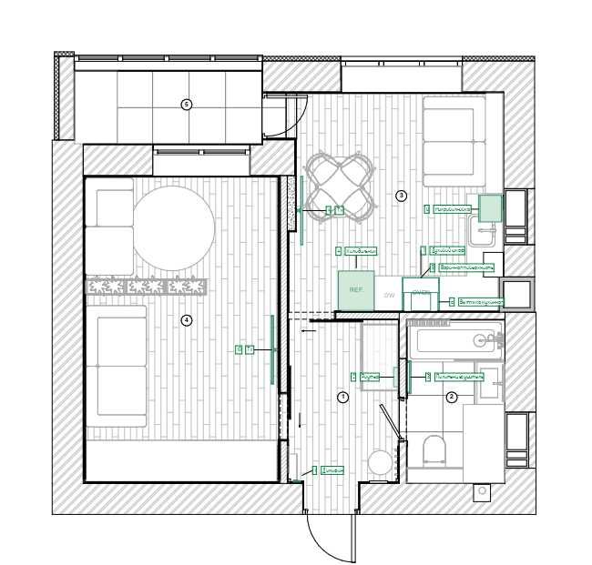 Площа квартири — 40,5 м2, зручно розподілена між однією спальнею, суміжним санвузлом і кухнею. Всі приміщення сплановані максимально раціонально, що дозволяє комфортно використовувати простір.