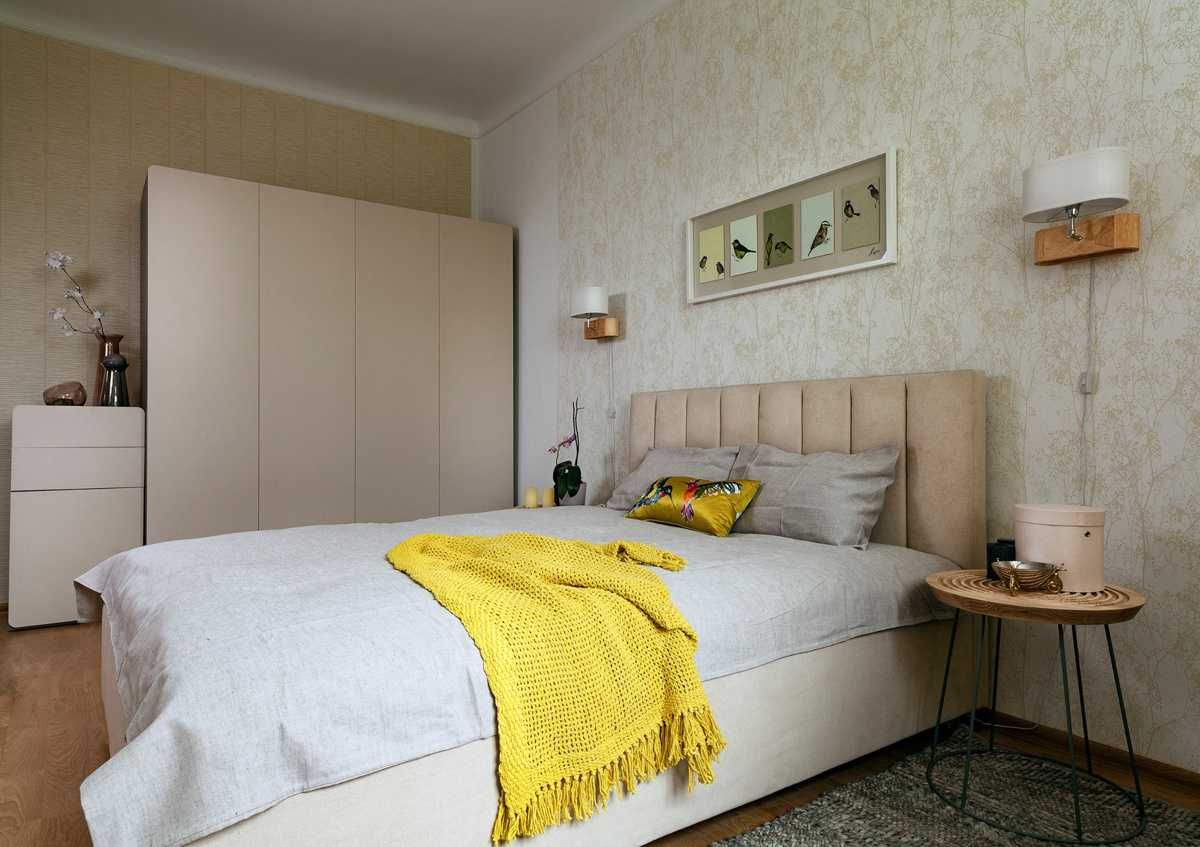 У просторій спальні (18 м²) великі вікна із жалюзями блекаут, кондиціонер, комфортне ліжко з ортопедичним матрацом, шафа, дизайнерські приліжкові столики, люстра та інші елементи інтер’єру, які можна залишити за бажанням власника.