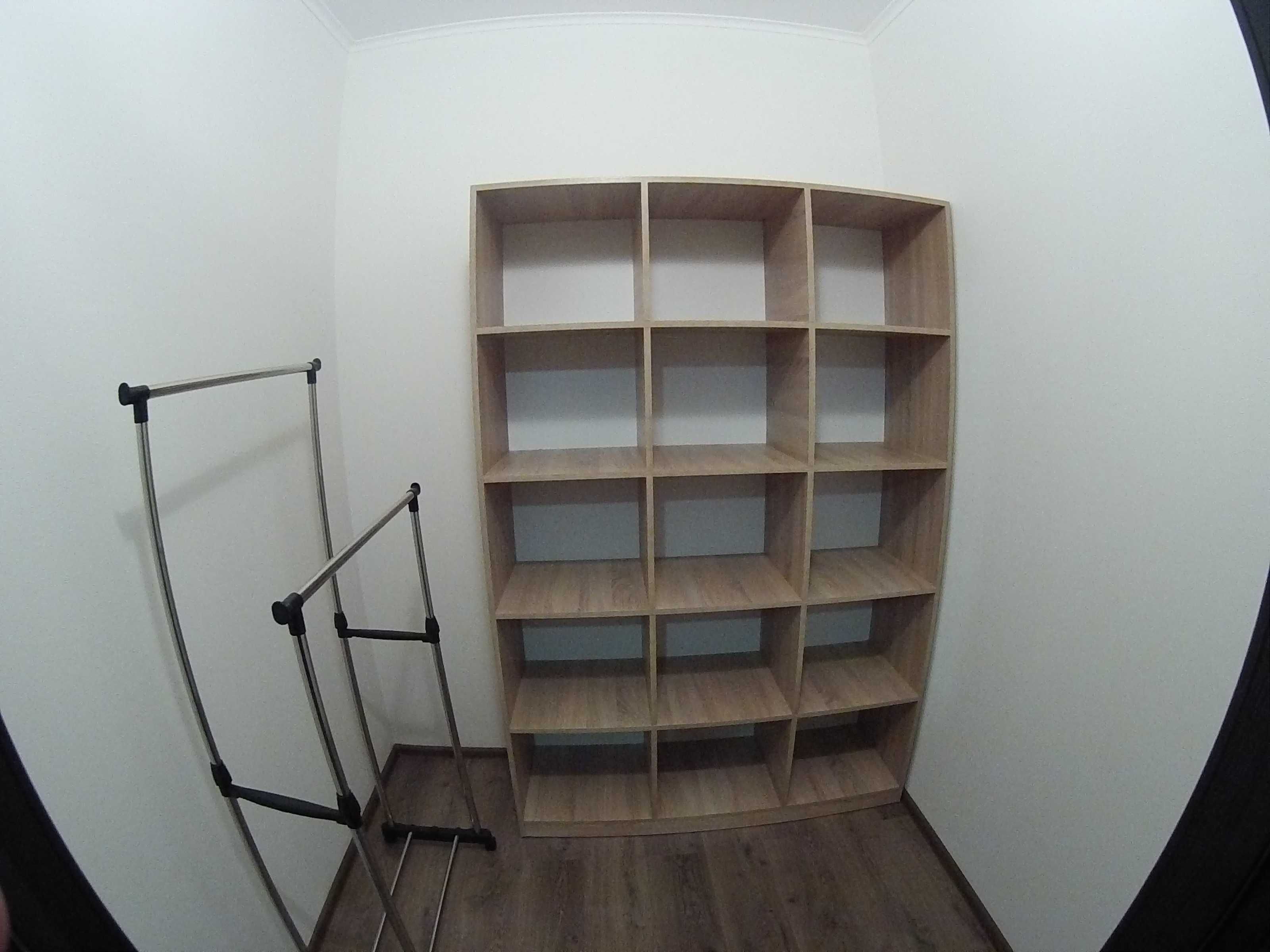 У кімнаті — двоспальне ліжко з ортопедичним матрацом, тумбочки, прасувальна дошка. Коридор облаштований прихожою з вішалками, гардеробна — стелажем. Лоджія засклена, що додає простору та світла.