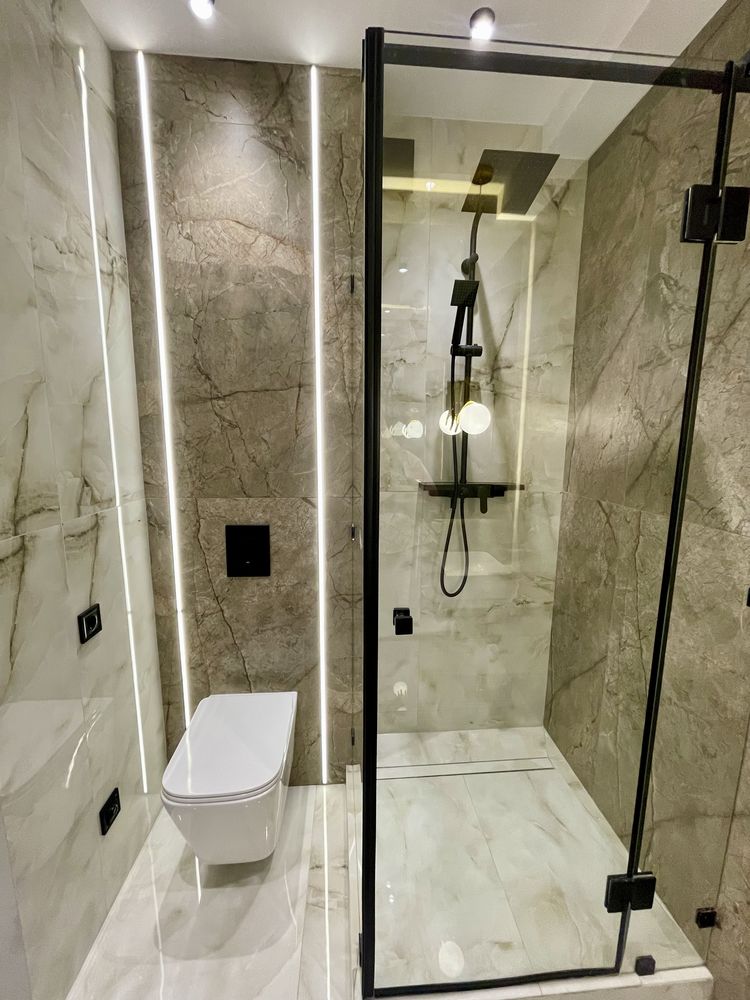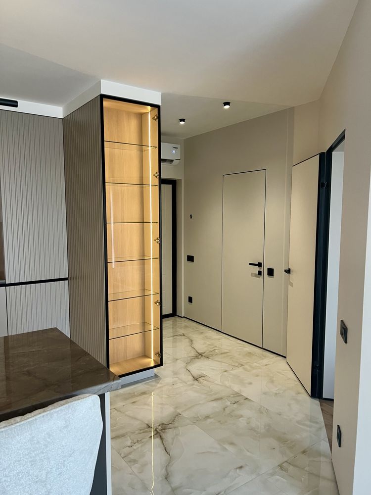 На підлозі укладений ламінат та плитка, а стильний санвузол обладнаний душовою кабіною. Житло повністю укомплектоване: встановлена тепла підлога, а меблі (з фарбованими фасадами та алюмінієвими профілями) та вбудована техніка (холодильник, посудомийна машина, плита, духовка, витяжка, кондиціонер, ТВ) залишаються новим власникам.