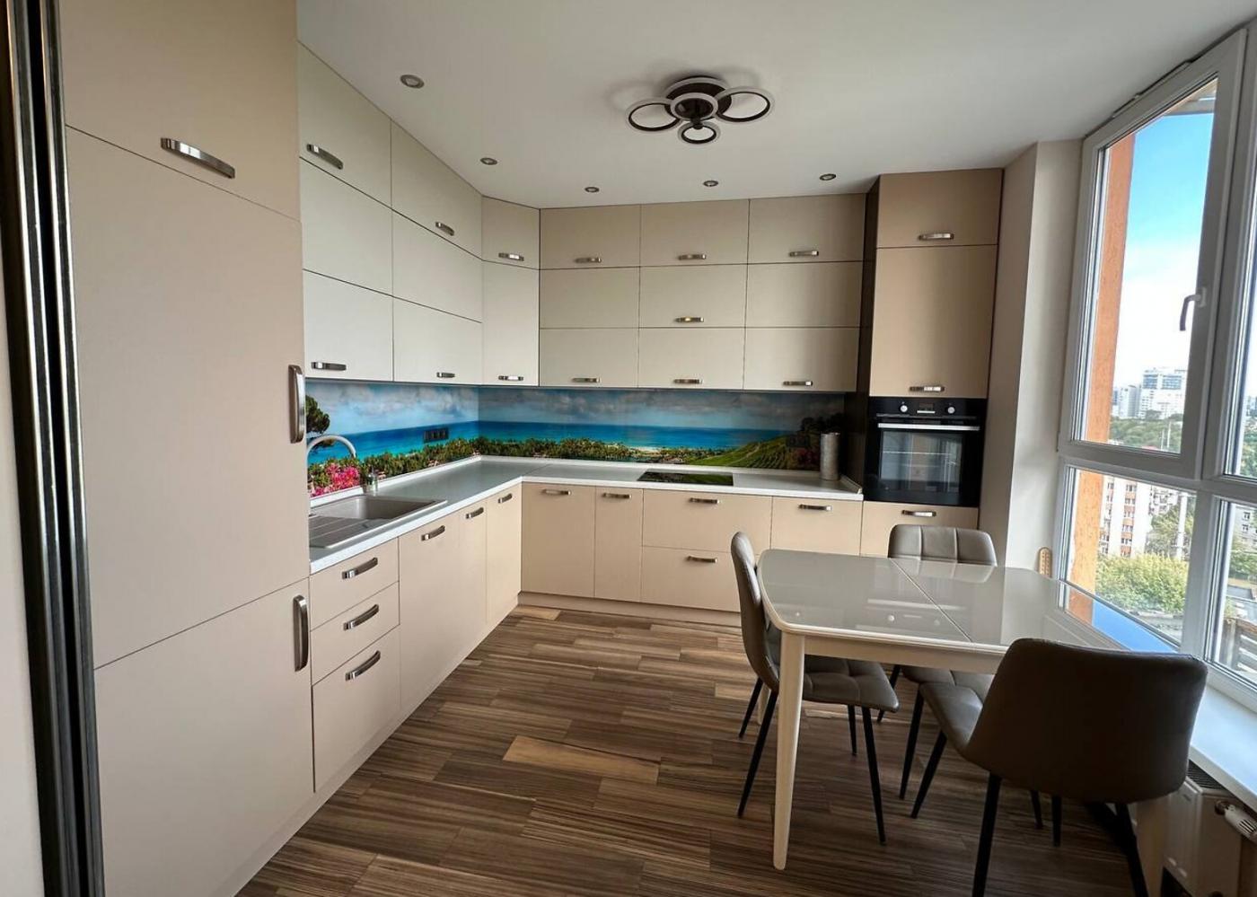 Ремонт виконано у сучасному дизайнерському стилі, меблі виготовлені на замовлення, побутова техніка — вбудована, якісна. Простір організовано з максимальною ефективністю: багато місця для зберігання, розсувна система дозволяє за потреби розділити приміщення на кухню та спальню.