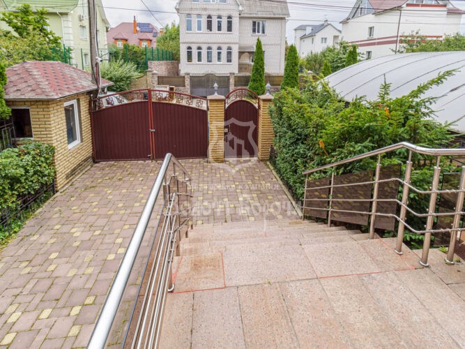 Заїзд у двір здійснюється через ворота, а при в’їзді обладнано приміщення для охорони. Гараж на 2 авто зі входом із будинку знаходиться у першому рівні. Біля двору також є додаткові паркувальні місця.