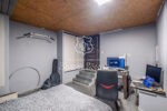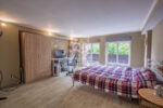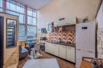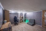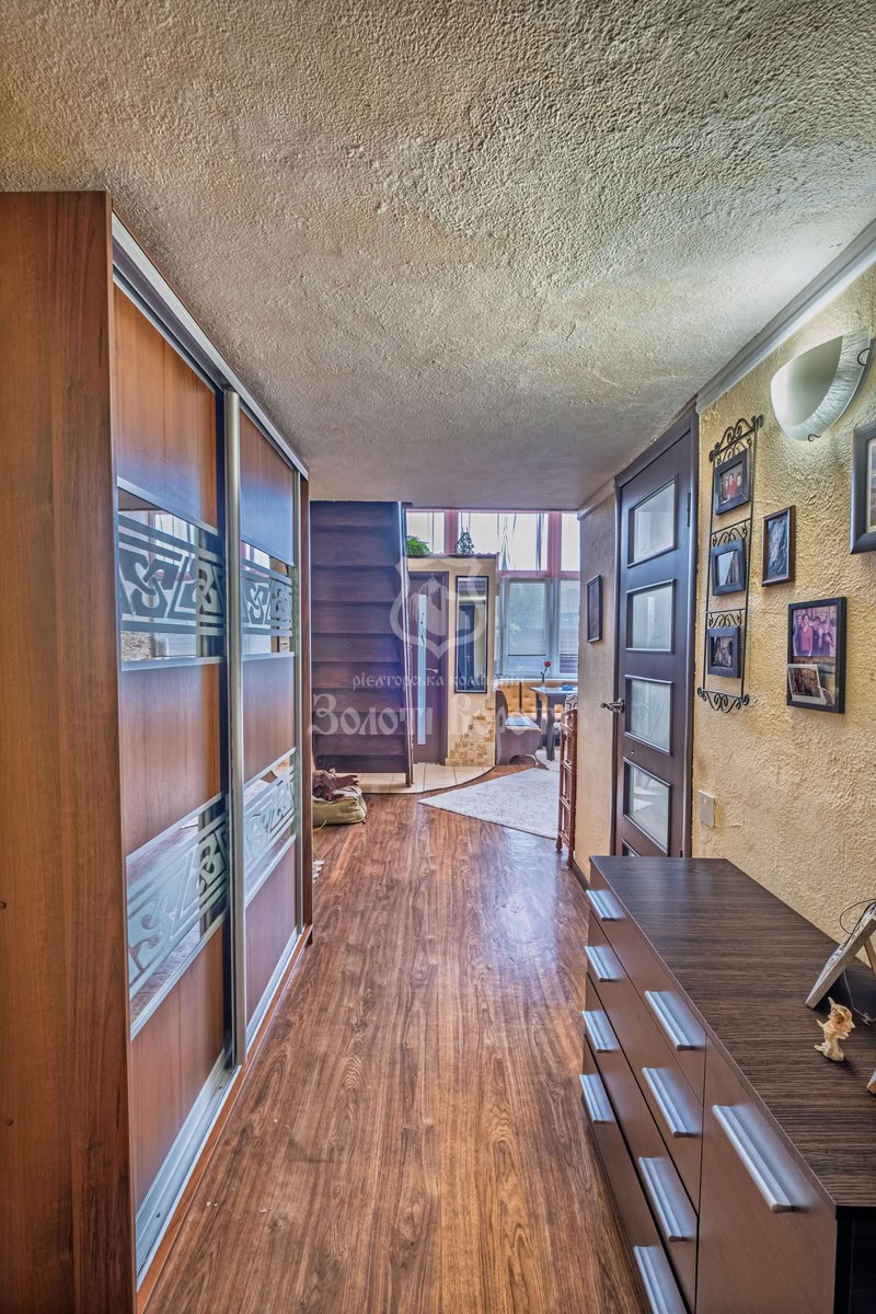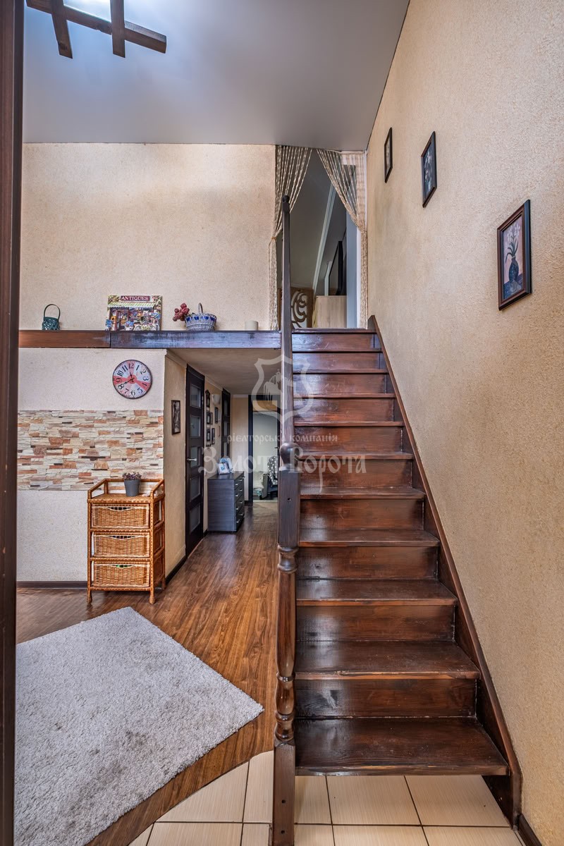 На другий рівень ведуть якісні дерев’яні сходи. Там розташовані дві суміжні кімнати, одна з яких має велике панорамне вікно. Квартира двостороння, вид з вікон — у двір. Всюди встановлені металопластикові великі панорамні вікна.