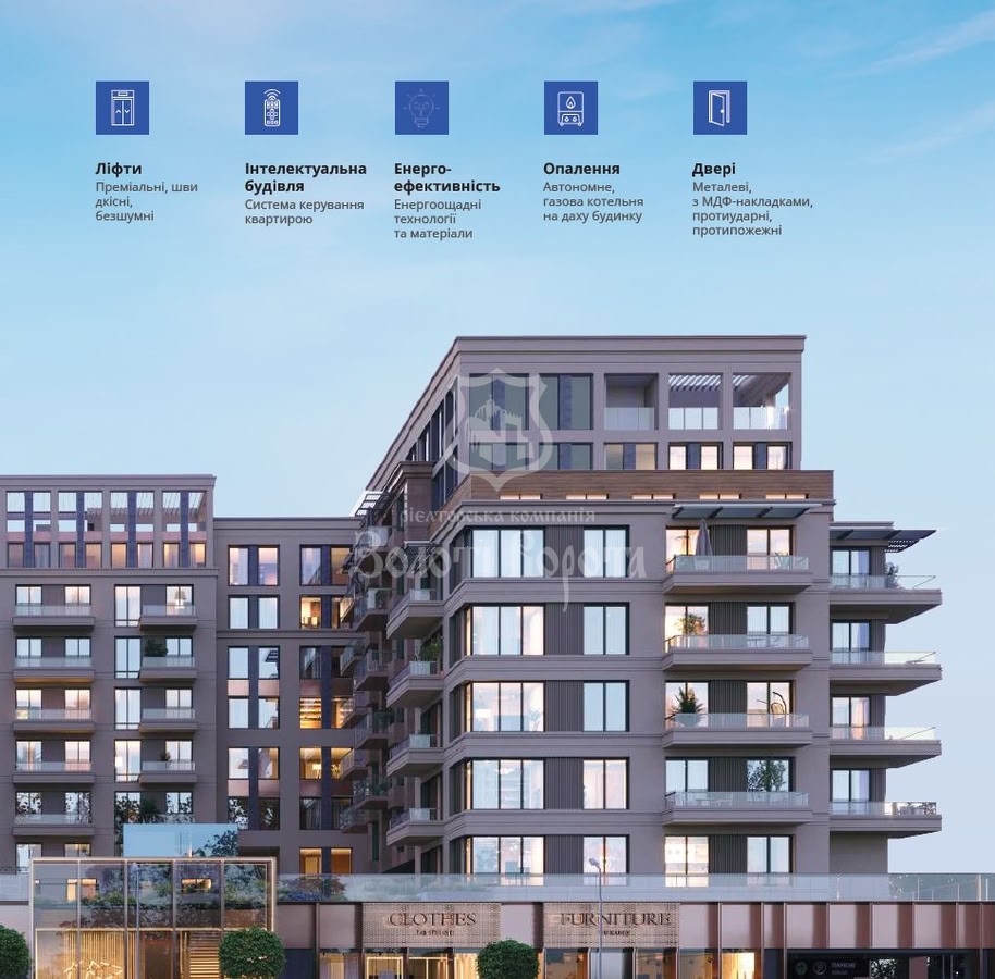 Інженерний рівень: високі стелі, панорамні вікна, автономне опалення, система очищення води, підземний паркінг із зарядками для електрокарів.