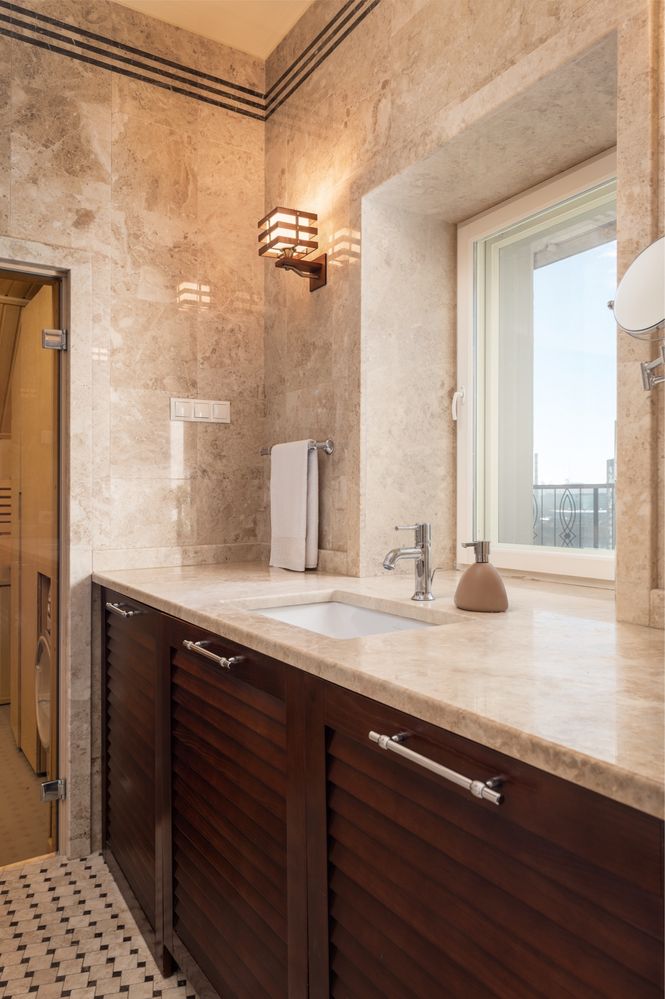Цей простір — не просто квартира, а справжня резиденція, що займає 7–9 поверхи сучасного будинку. Загальна площа — 350 м², включаючи розкішну терасу на даху (110 м²), виконану з натуральної червоної деревини.