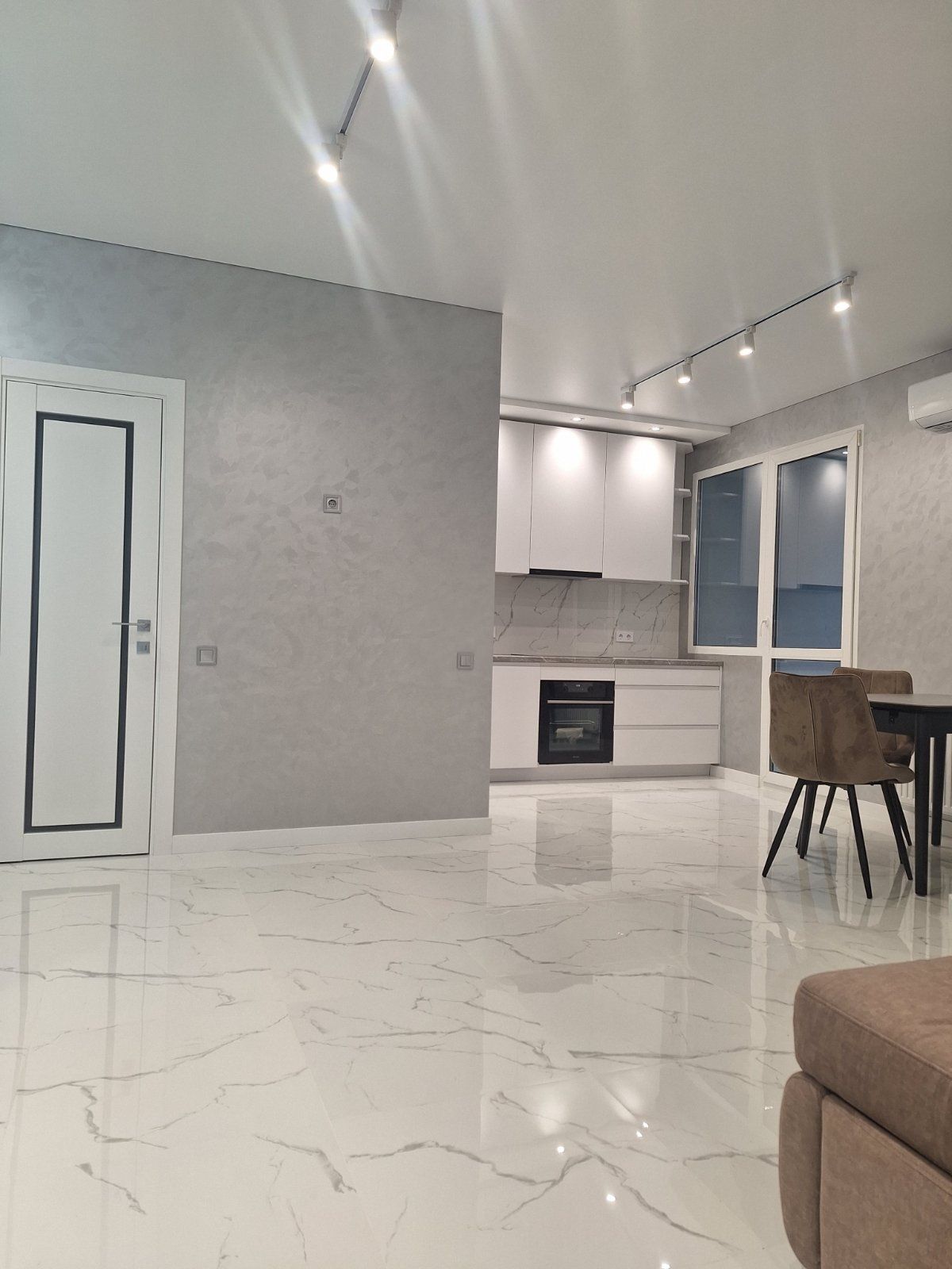 Квартира після ремонту, дуже світла й затишна. Укомплектована всім необхідним: вбудована кухня, холодильник, посудомийна машина, меблі, просторе спальне місце з великим ліжком.