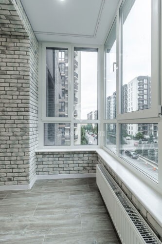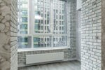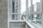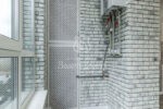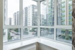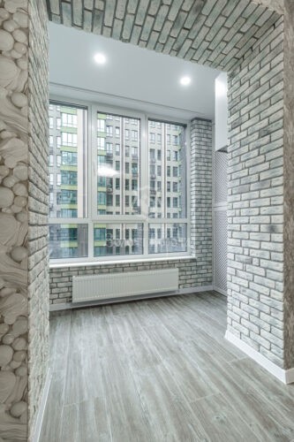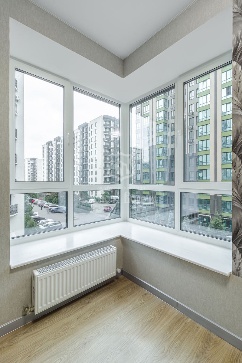 Лоджія інтегрована в кухонний простір, що додає світла та простору. Вікна — великі панорамні, металопластикові, з видом у двір.