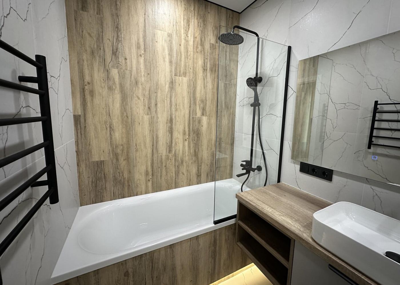 Підлога — кварцвініл, вкладений «ялинкою». У ванній кімнаті — тепла підлога та тепла стіна для сушіння рушників.
