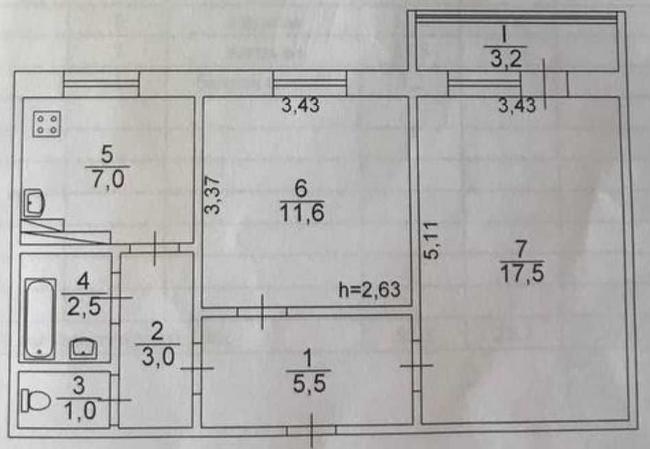Житлова площа — 29,1 м² (кімнати 11,6 м² та 17,5 м²), кухня — 7 м², два коридори, ванна, туалет, засклений балкон. Будинок газифікований, проведено три мідні силові електролінії для потужної техніки. Висота стелі — 2,63 м.