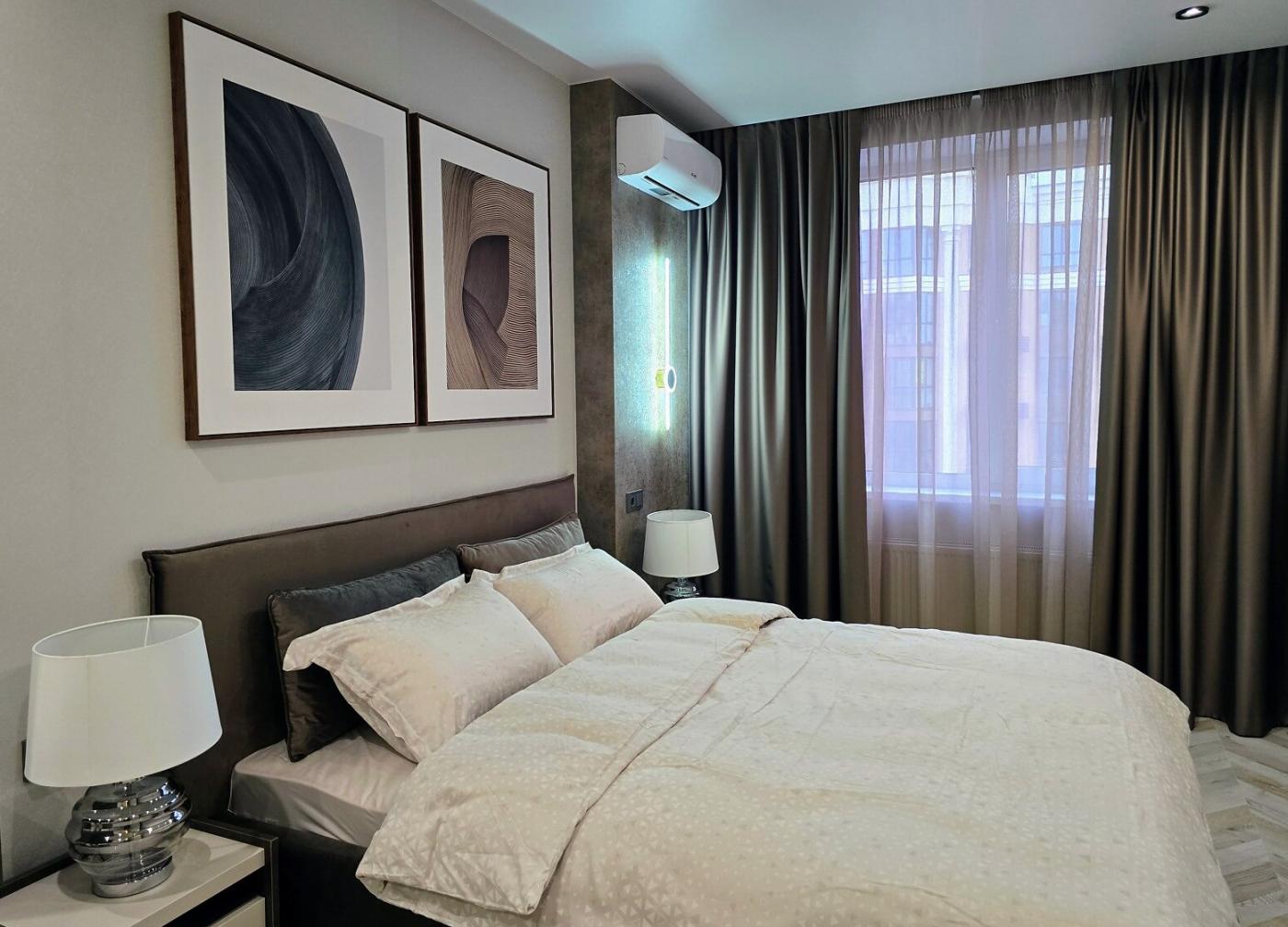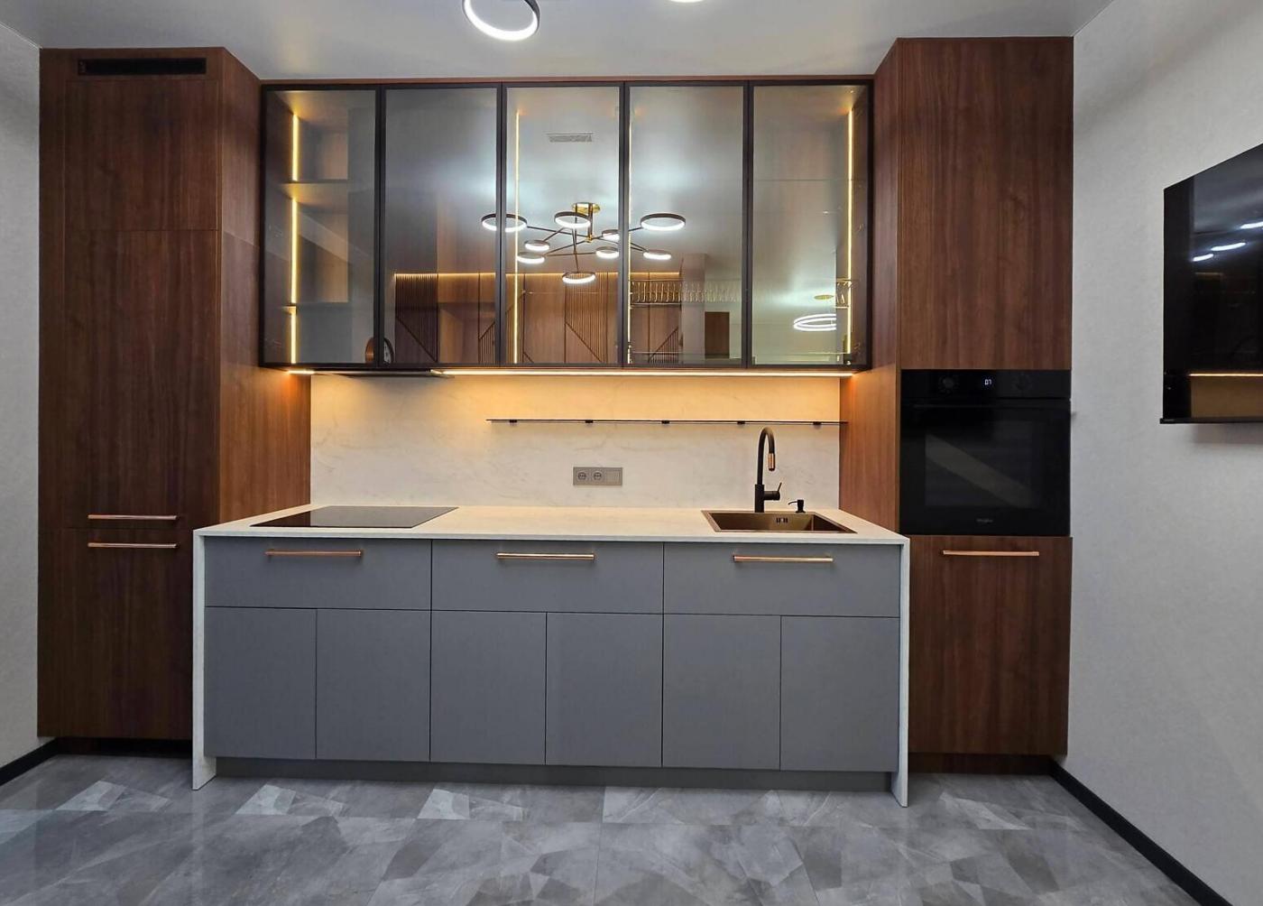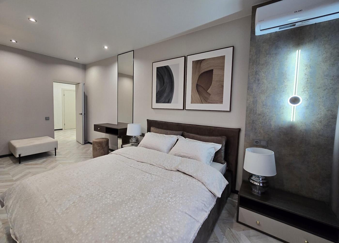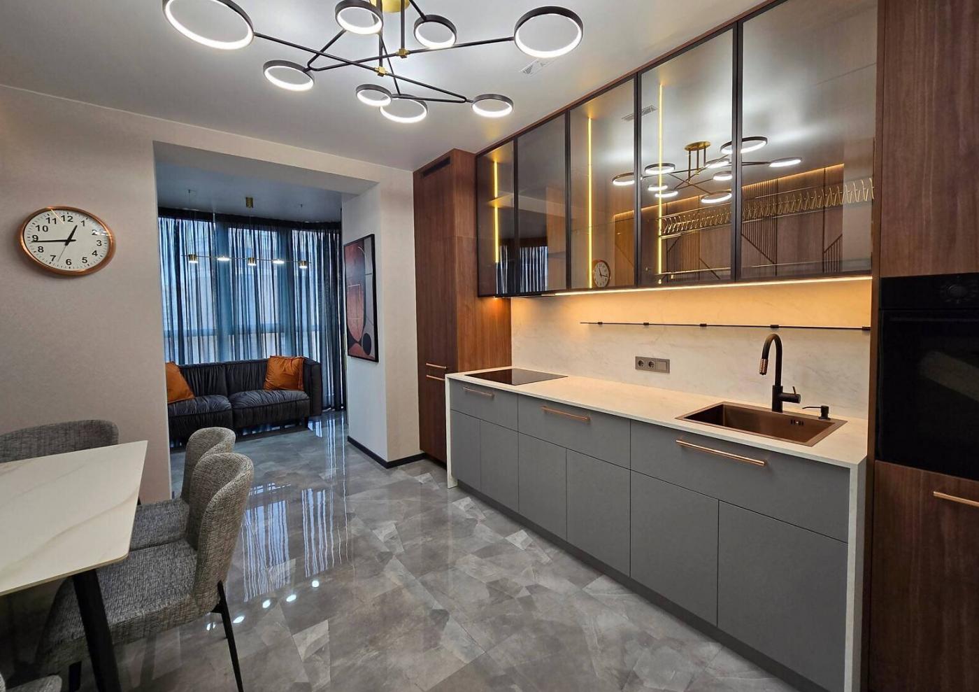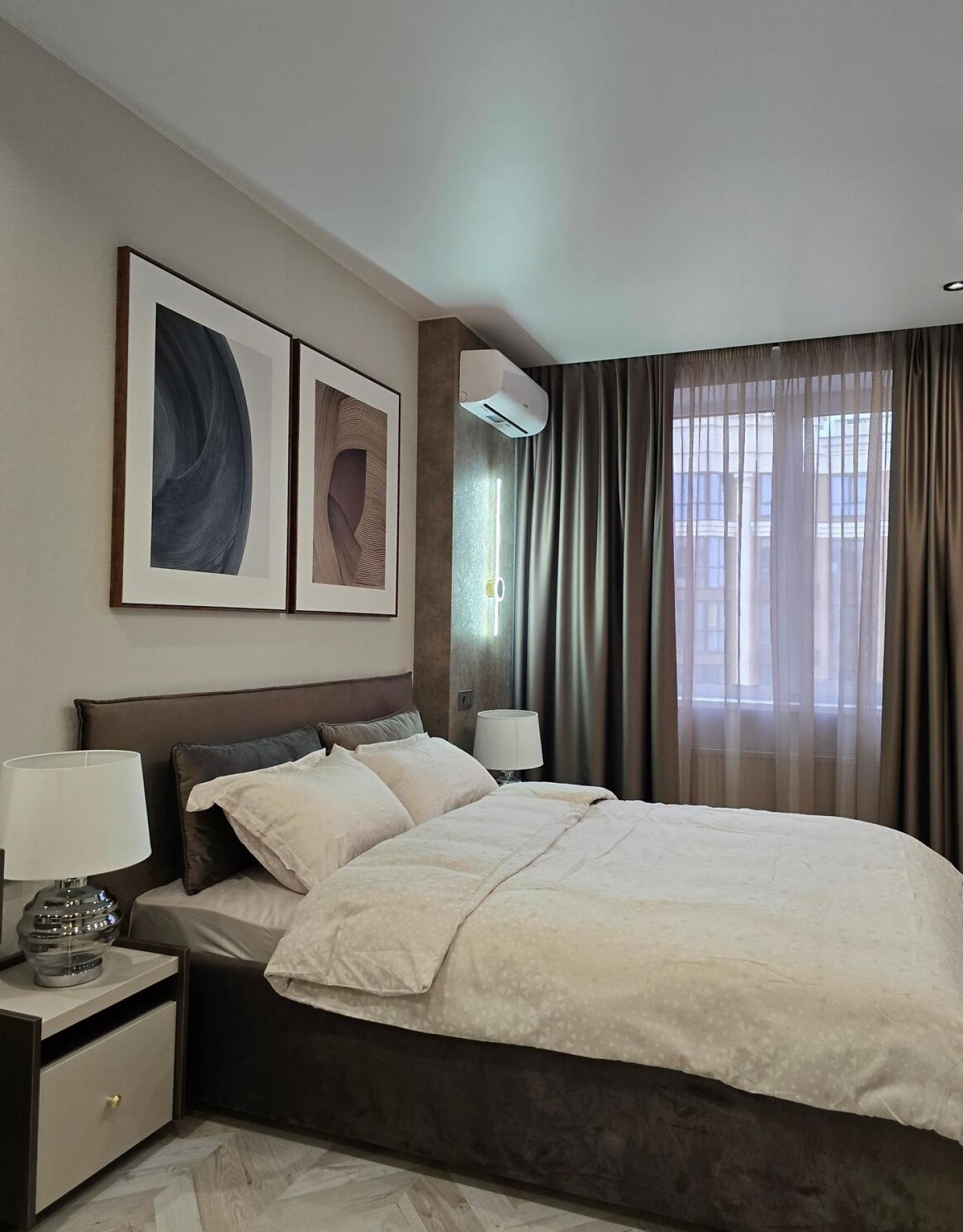 У квартирі — два санвузли з якісною сантехнікою та теплою підлогою, встановлені кондиціонери, духова шафа, холодильник, посудомийна машина, нові меблі.