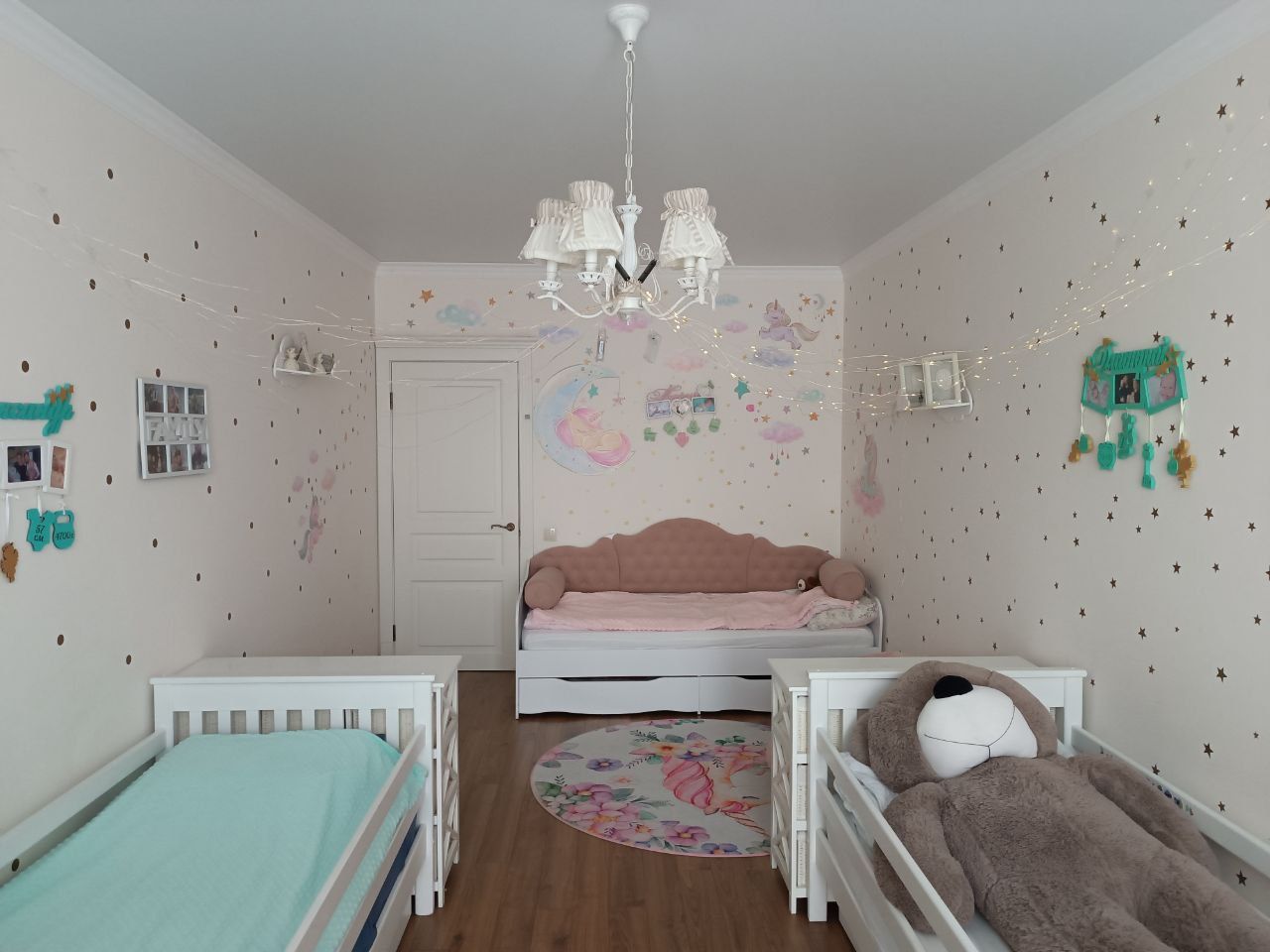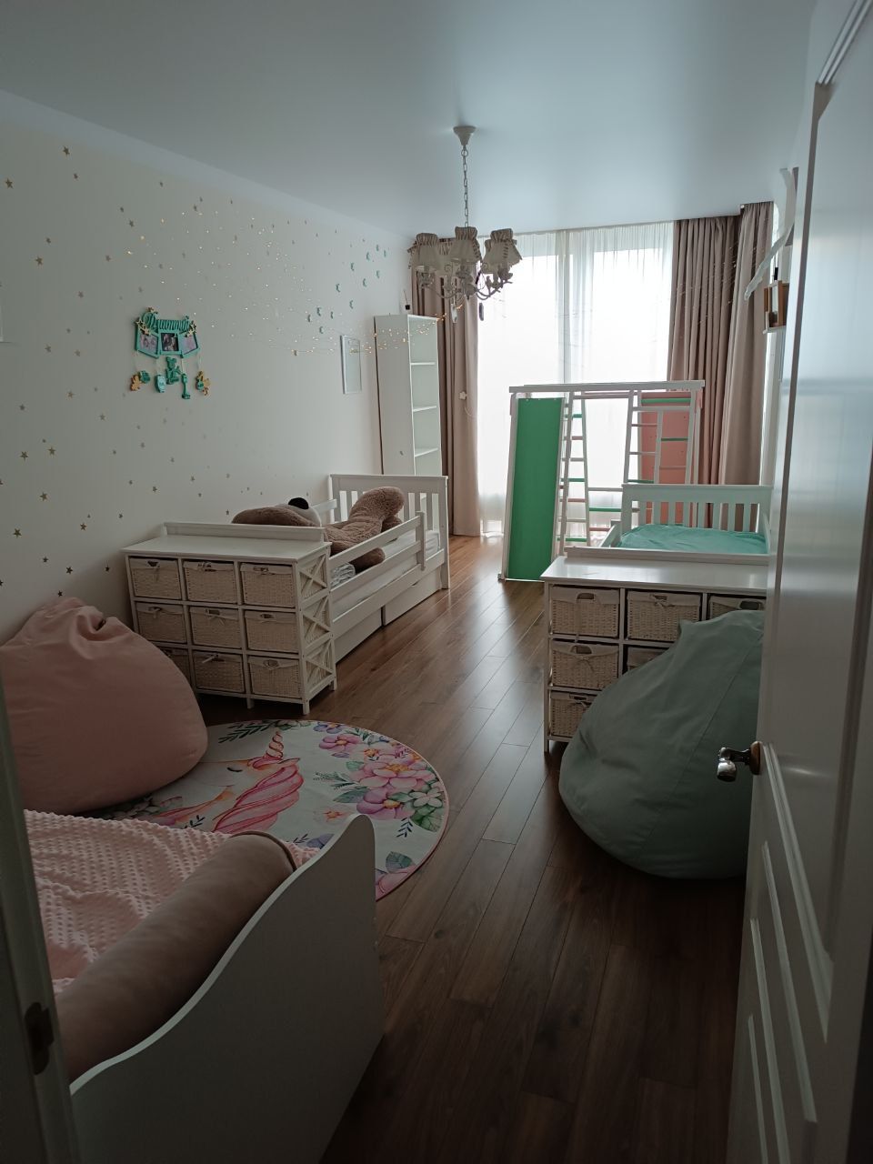 Спальня площею 18 м² має вихід на французький балкон, велике велюрове ліжко з підйомним механізмом, шафу, кондиціонер та телевізор. Дитяча кімната — 22 м², обладнана трьома дерев’яними ліжками, двома великими стелажами та ігровим комплексом.