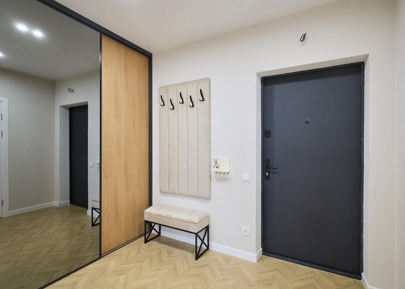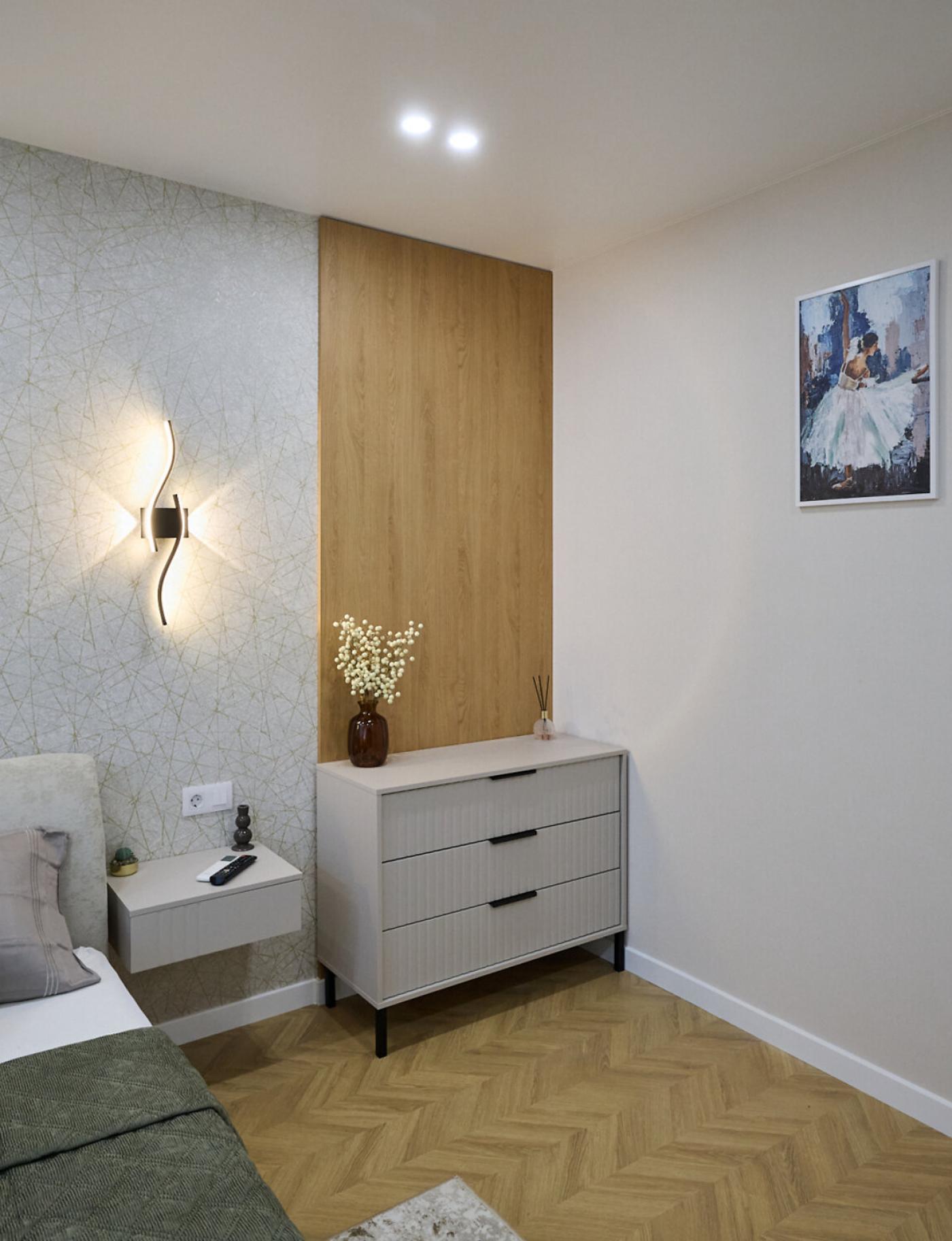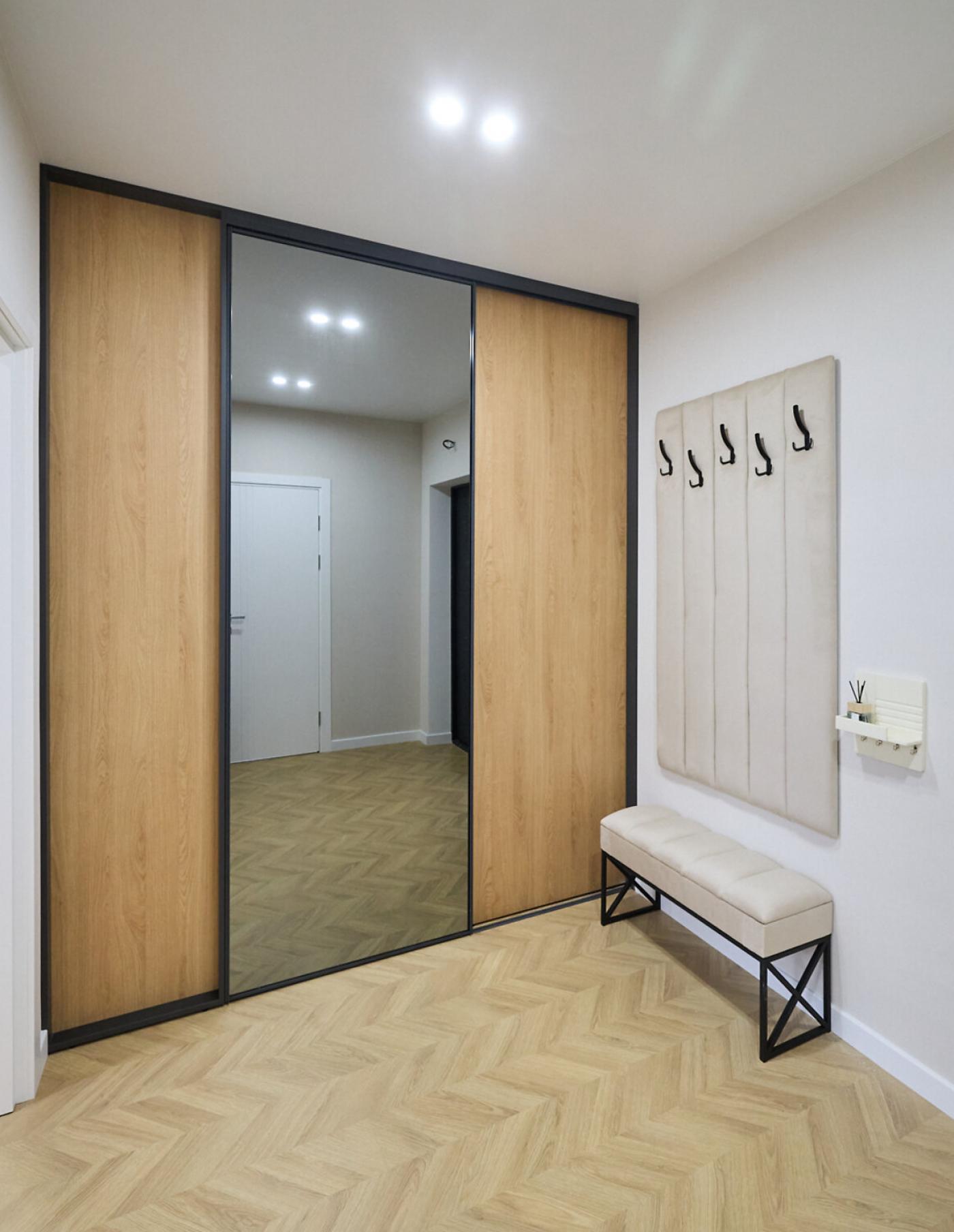 Квартира площею 49м2 має продумане планування: простора кухня-вітальня 18м2, окрема гардеробна кімната та засклений балкон.