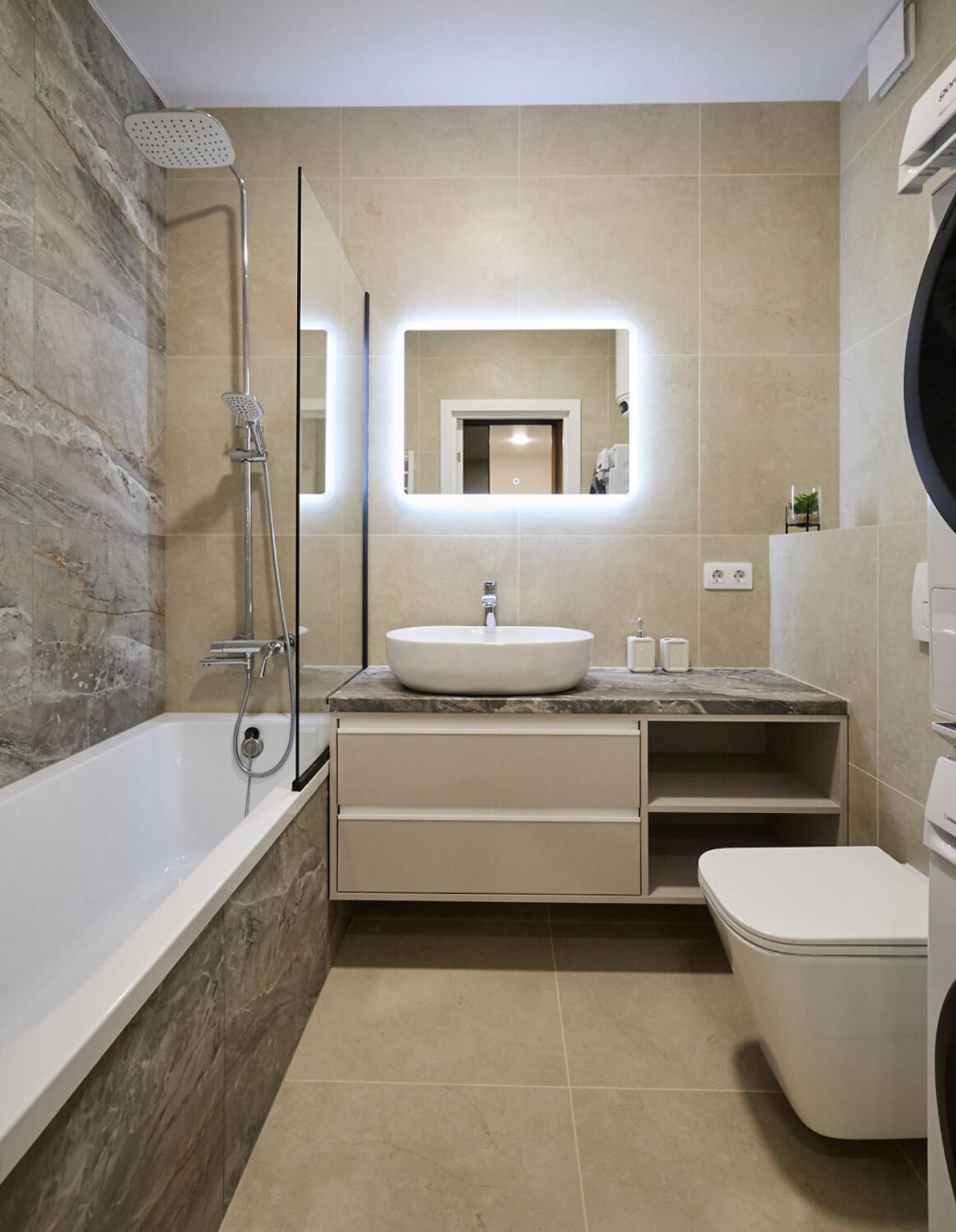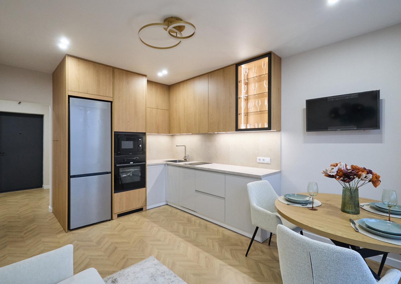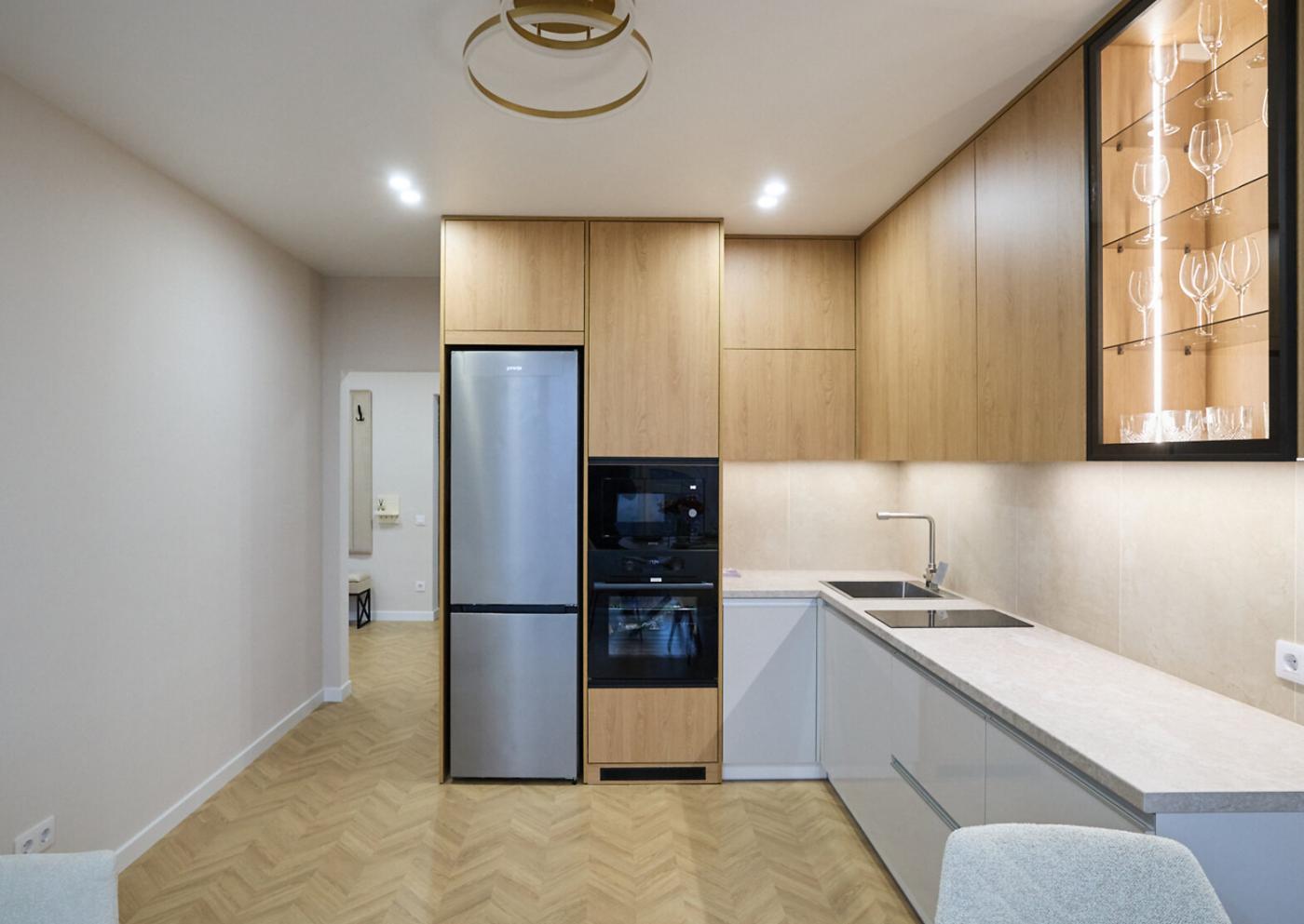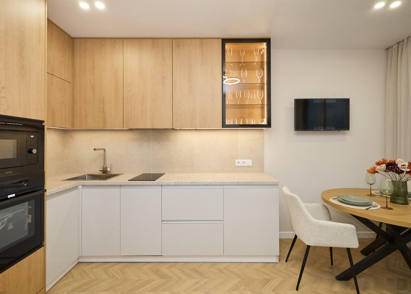 Квартира площею 49м2 має продумане планування: простора кухня-вітальня 18м2, окрема гардеробна кімната та засклений балкон.