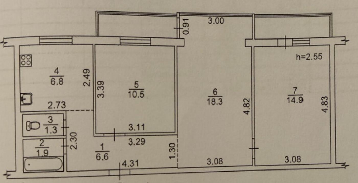Помешкання розташоване на 7 поверсі 9-поверхового будинку, має продумане планування: дві окремі кімнати, одна прохідна, роздільний санвузол, два балкони на один бік. Загальна площа — 64,2 м², житлова — 43,7 м², кухня — 6,8 м².