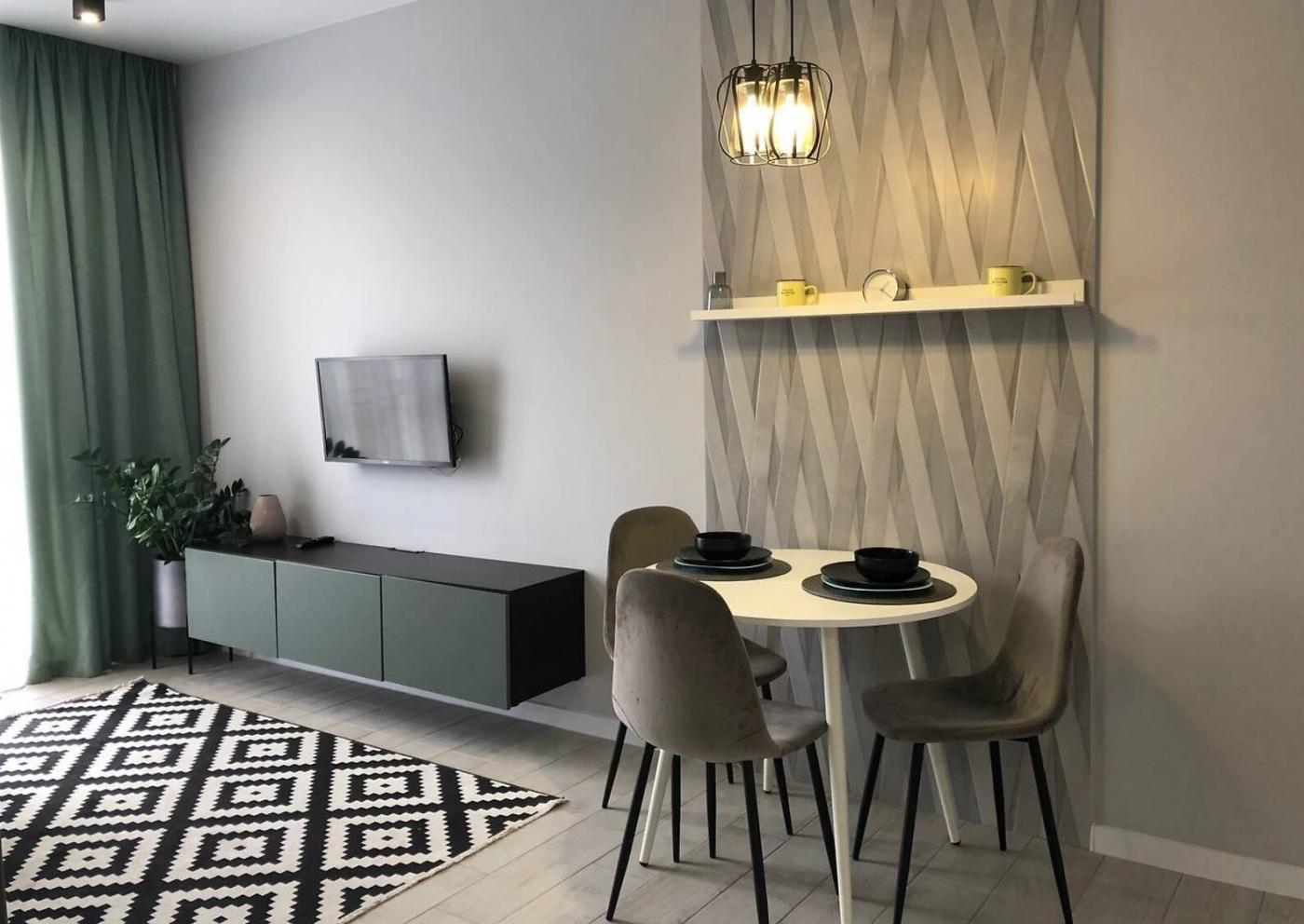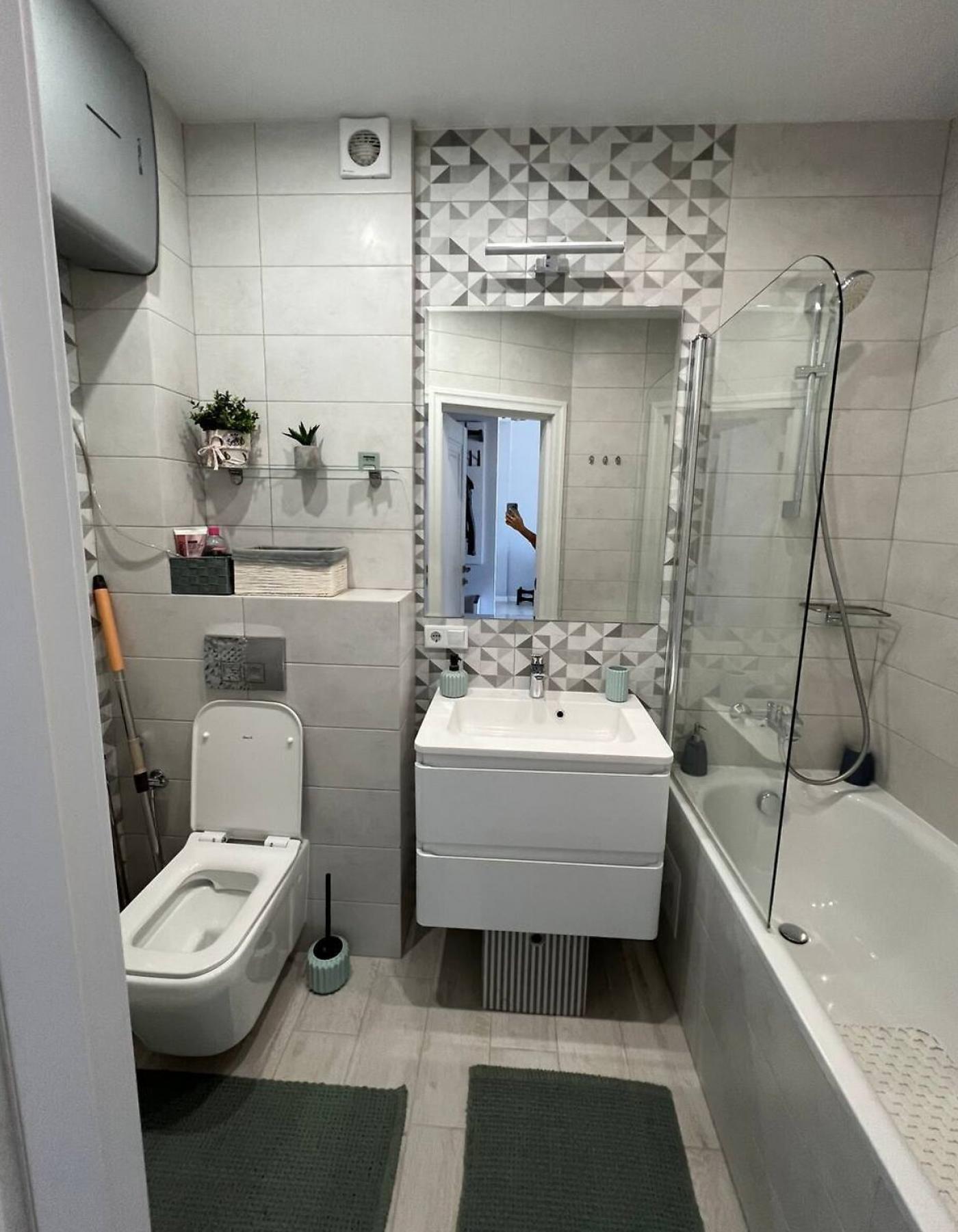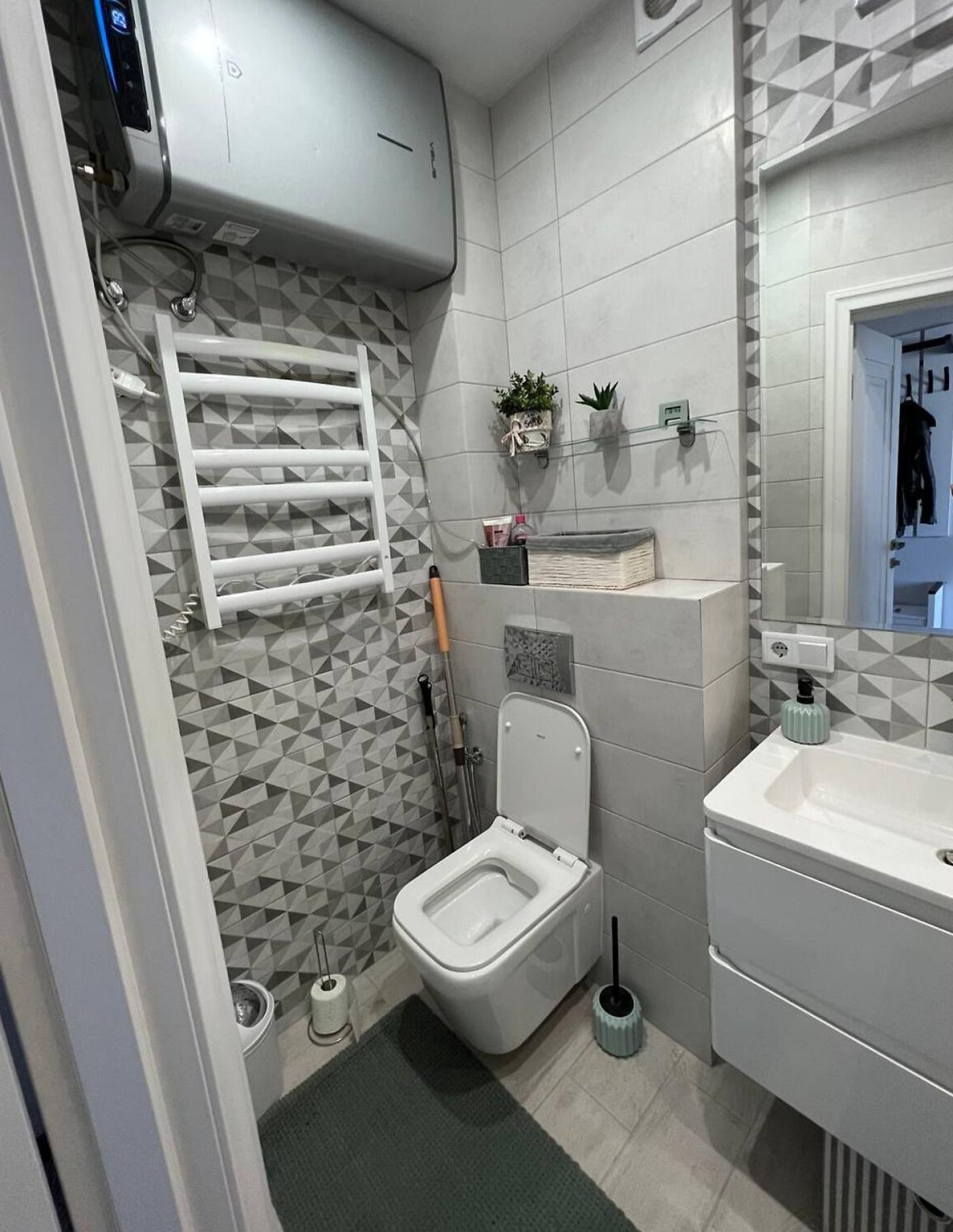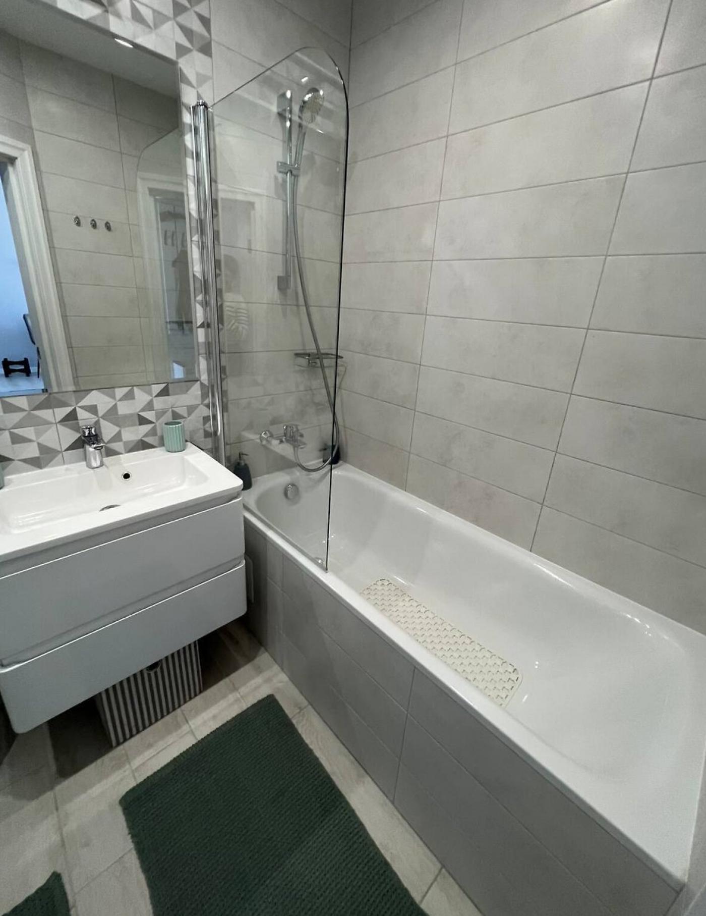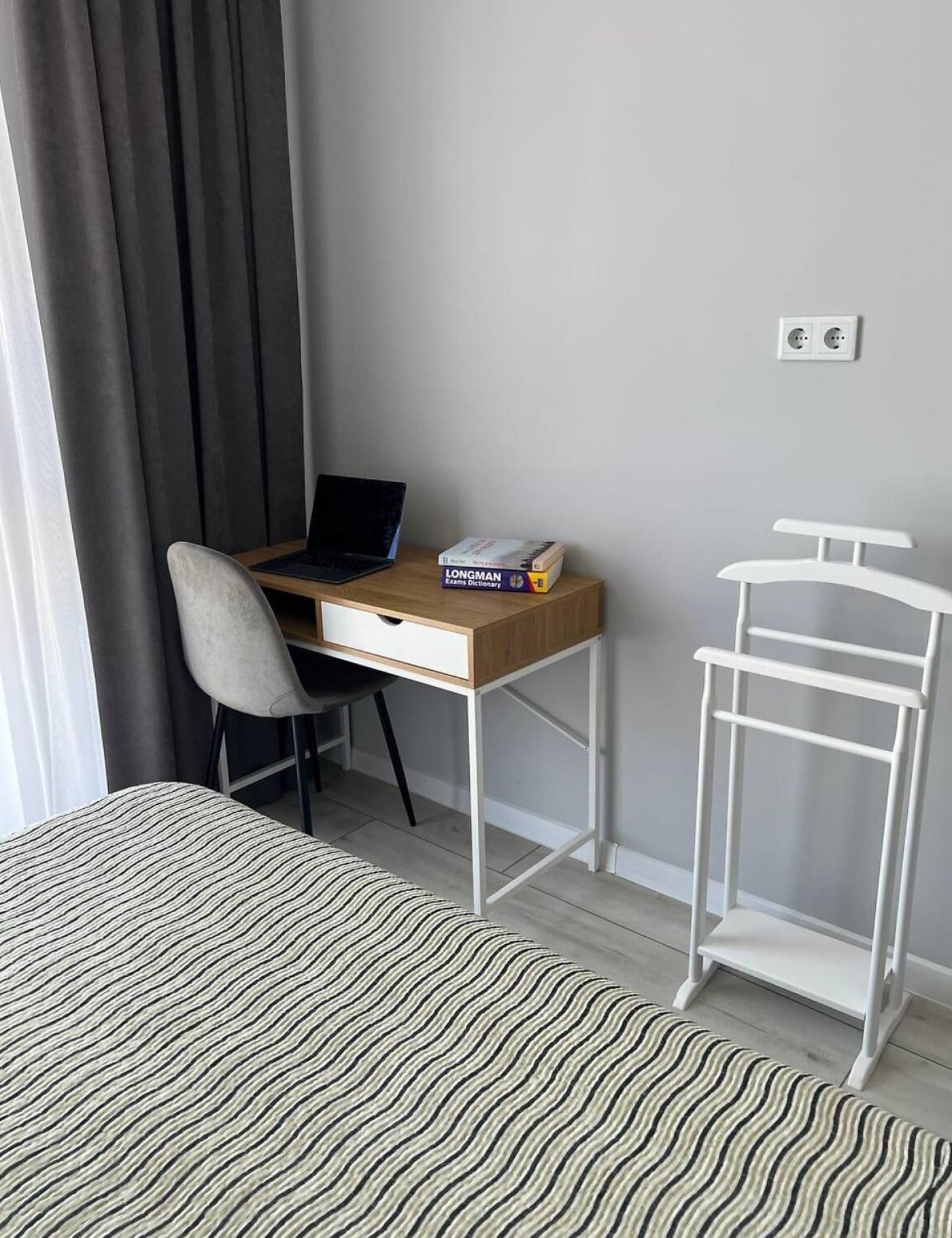 Житло повністю мебльоване: двоспальне ліжко з відмінним ортопедичним матрацом, шафа-купе, зручний гостьовий диван та інше. Санвузол спільний, обладнаний теплою підлогою та ванною.