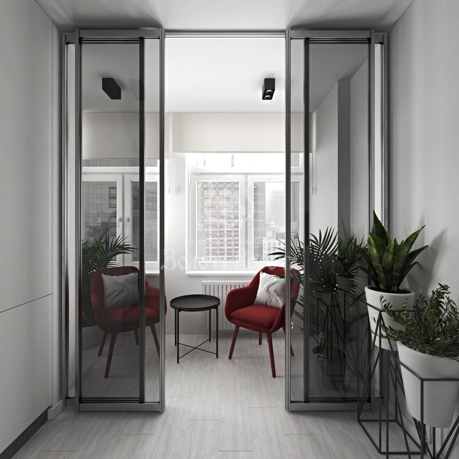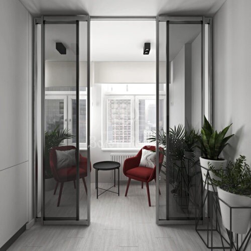 Оздоблення виконане з використанням сучасних матеріалів: стіни — декоративна штукатурка, стеля — гіпсокартон, підлога — зносостійкий ламінат.