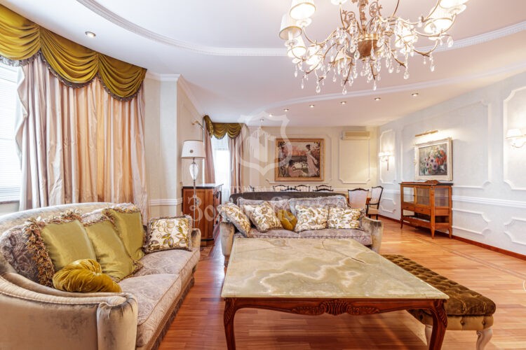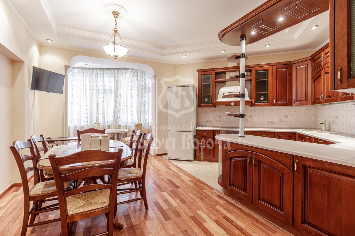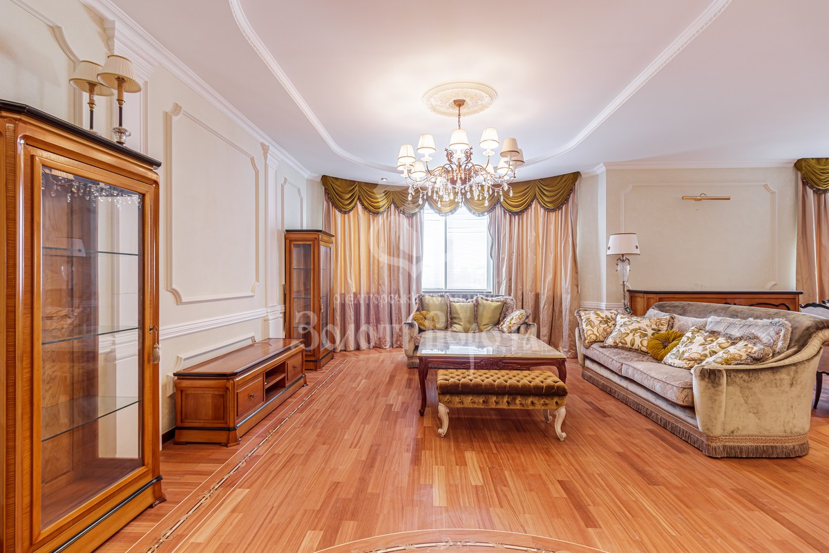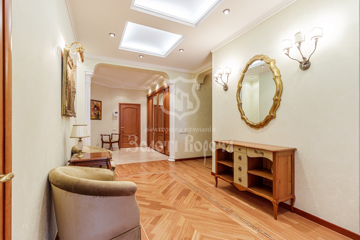 Квартира розташована на 11 поверсі 17-поверхового цегляного будинку та має загальну площу 210 м², що забезпечує комфортне проживання для великої родини.