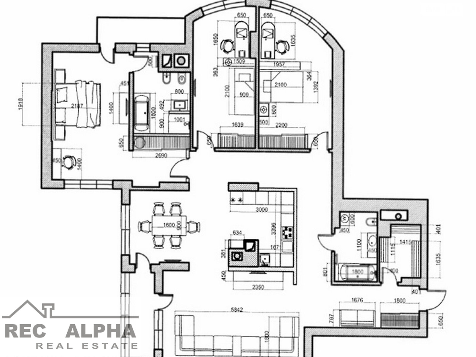 Загальна площа квартири — 169,8 м². Планування продумане до дрібниць і чітко розділяє гостьову та приватну зони. Простора вітальня з кухонною та обідньою зонами, гардеробними та великим гостьовим санвузлом займає близько 90 м² — ідеальний простір для сімейного життя та прийому гостей.