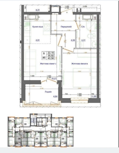 | Площа, кв.м.: | 40.56/22.16/9 |