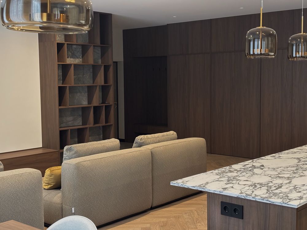 Квартира на фінальній стадії реалізації дизайнерського ремонту — попереду декор та професійна фотозйомка. Використані преміальні матеріали та рішення: кухонний острів 2,7 м з натурального каменю, загальна довжина стільниць 6,5 м, техніка Siemens, корпусні меблі з МДФ та Saviola, м’які меблі Blanche з можливістю трансформації. Інтер’єр сучасний, стильний, з акцентом на простір, світло та комфорт, об’єкт рівня бізнес/преміум.