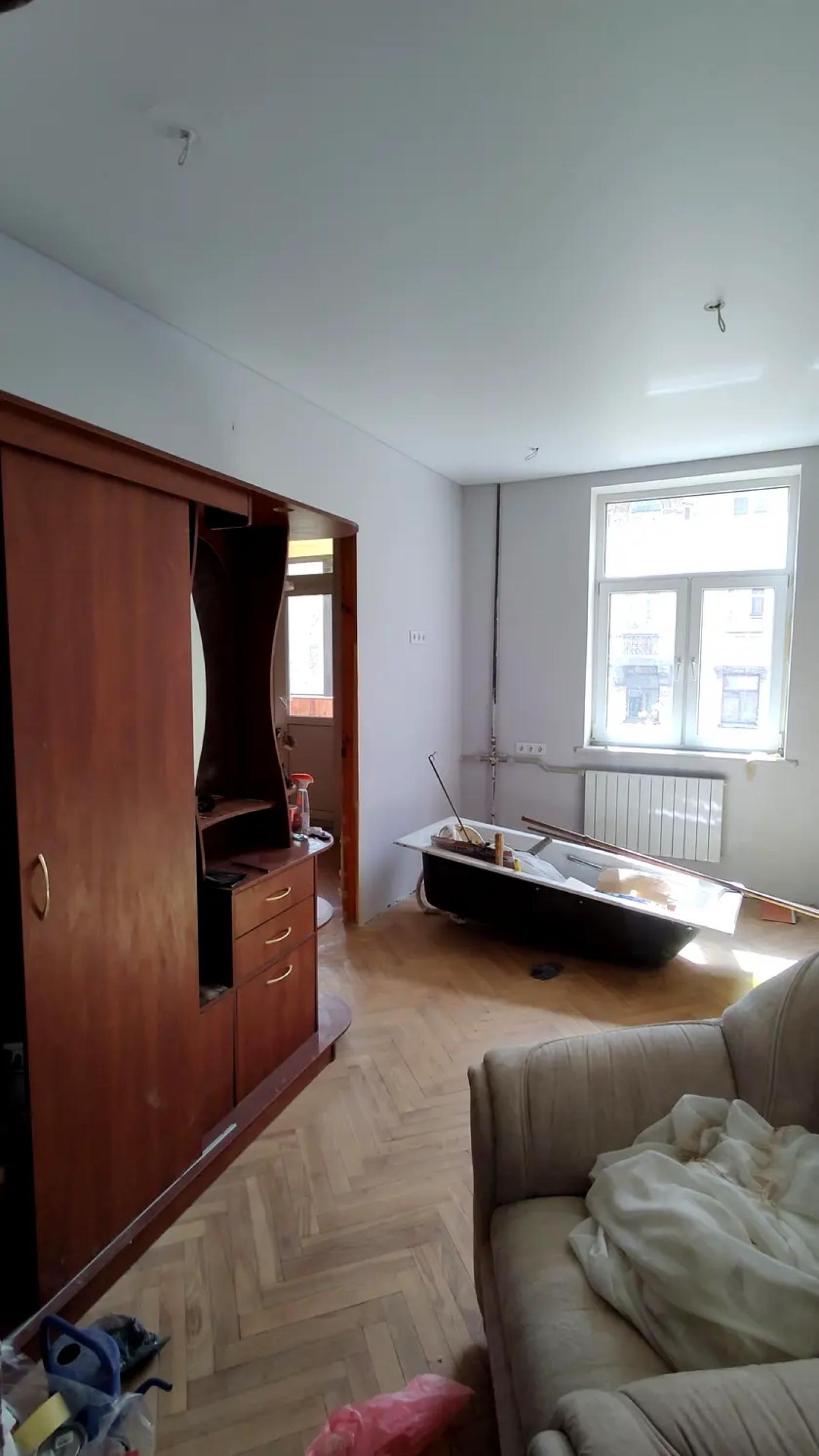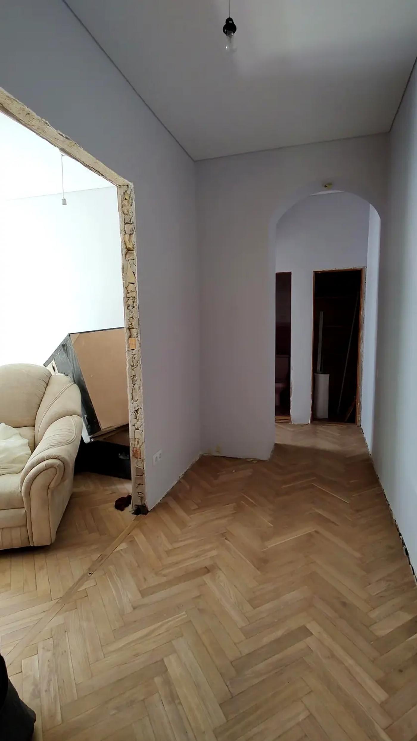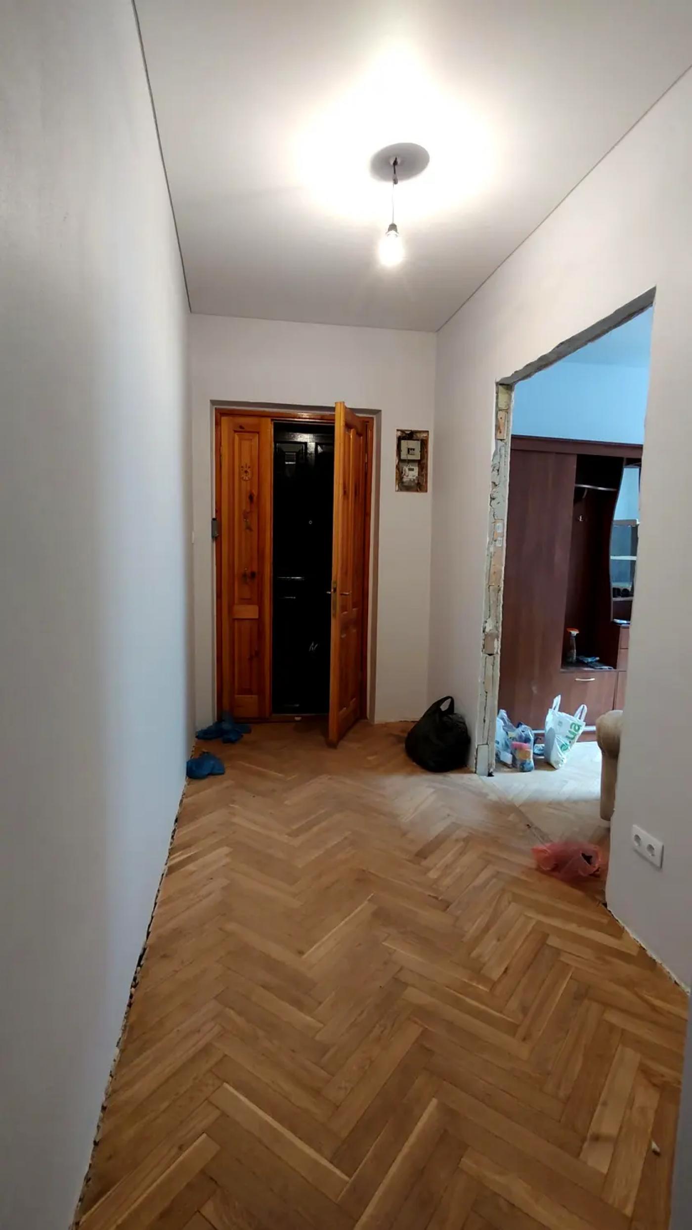 У квартирі вже виконано значну частину підготовчих та ремонтних робіт: демонтовано старі покриття, вирівняно стіни, частково замінено газову трубу, повністю оновлено електропроводку з додатковими розетками та встановлено сучасний лічильник. Стіни під фарбування, нанесено два шари фарби, натяжні матові стелі у кімнатах, кухні та коридорі. Підлога — відшліфований паркет із першим шаром лаку, на кухні облаштований новий плитковий фартух, встановлена робоча газова плита з духовкою. Це варіант, де основа вже зроблена, і залишилось довести під себе.