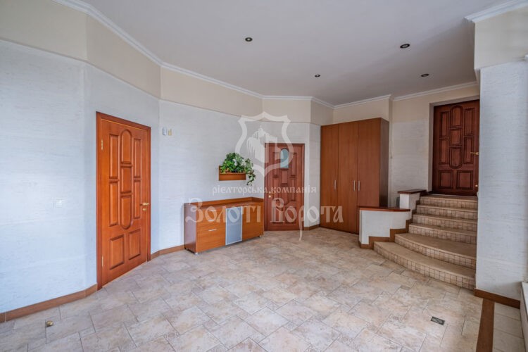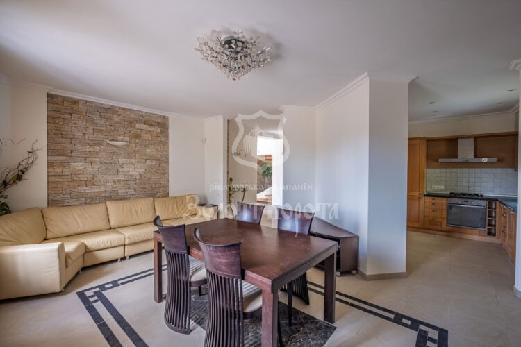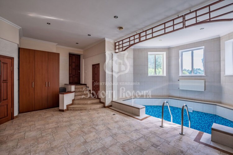 На першому поверсі розташована простора кухня-вітальня площею 43 м2, поділена на функціональні зони. Є сауна, басейн із виходом у двір та санвузол.