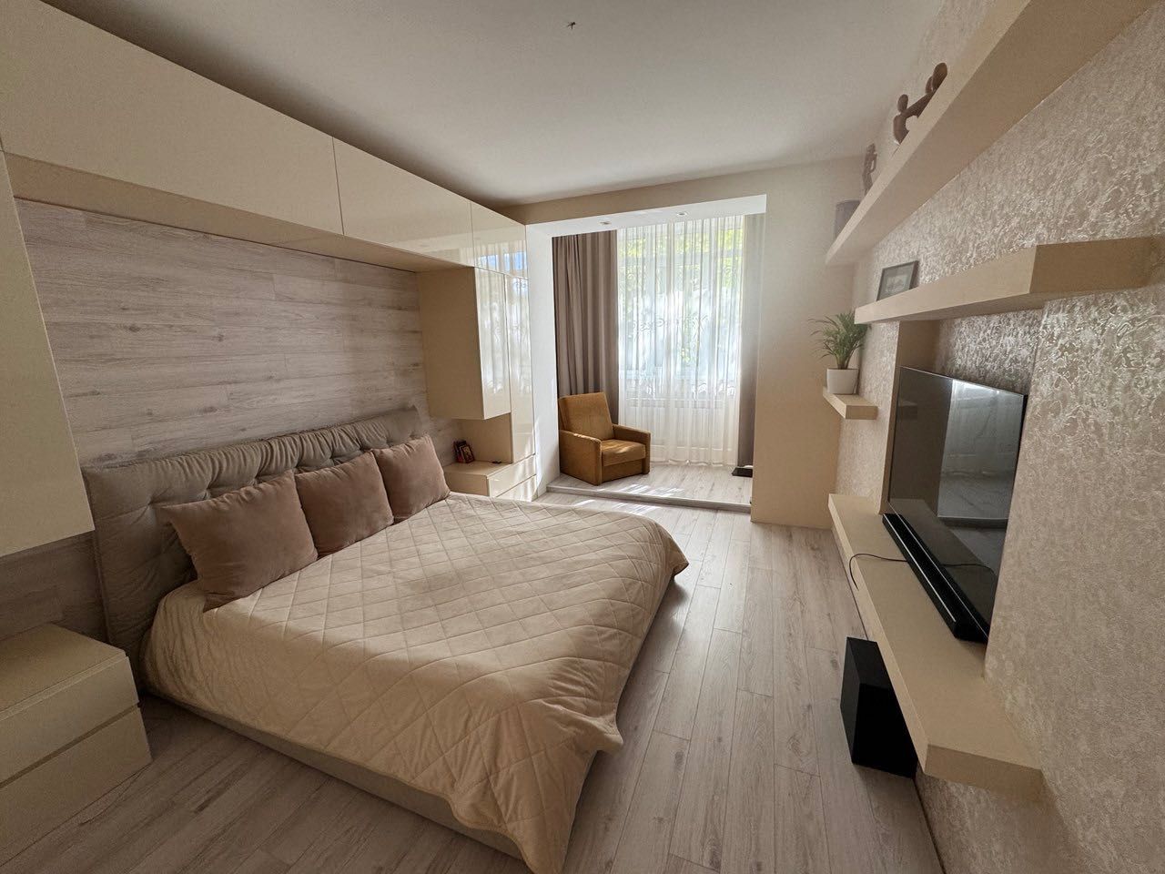 У кімнатах встановлено комфортне ліжко, містка шафа для одягу, вбудовані меблі та функціональні шафи-купе. Якісна побутова техніка також залишається новому власнику. Один з балконів засклений, що додає додаткового затишку та функціональності.