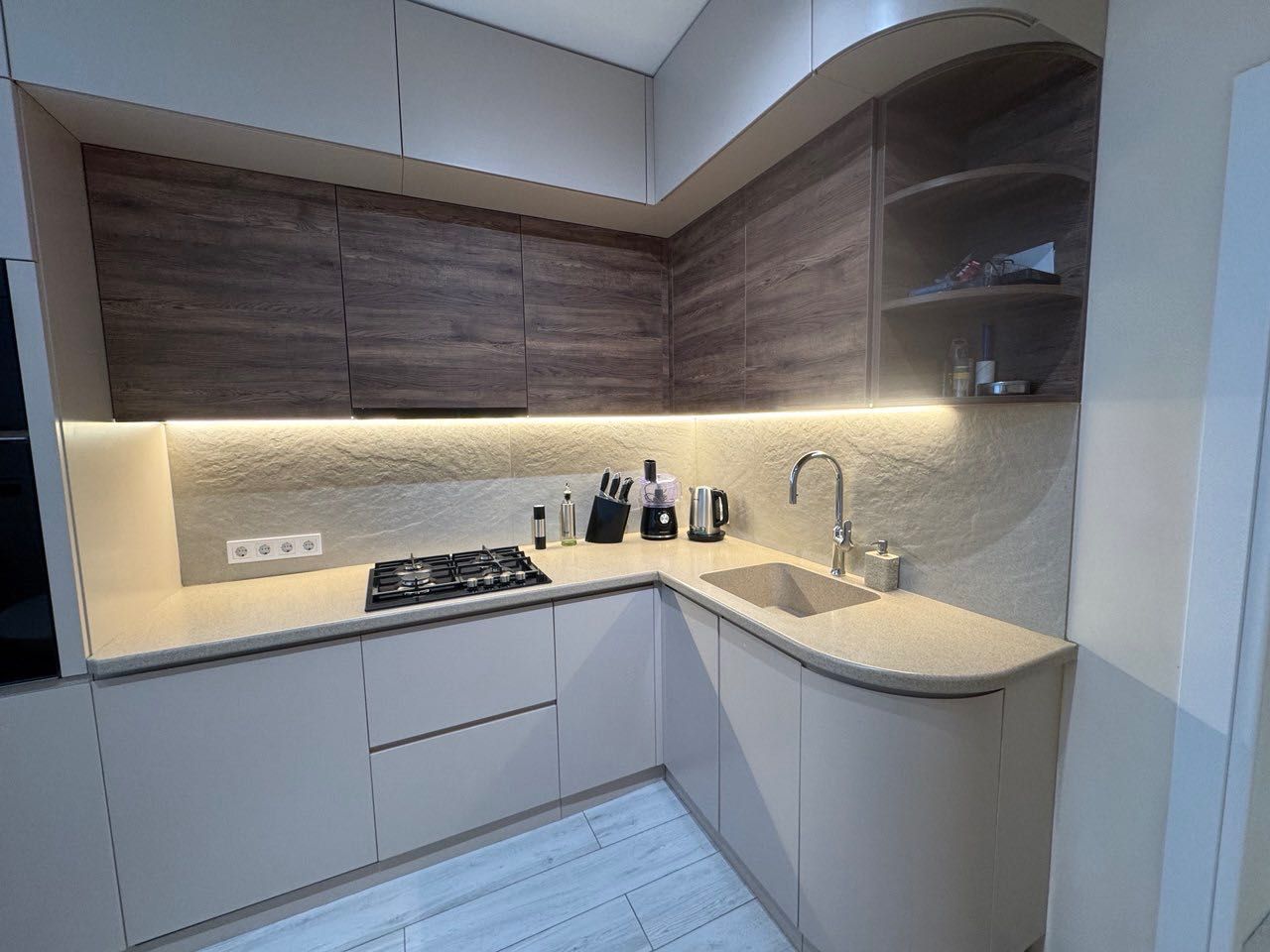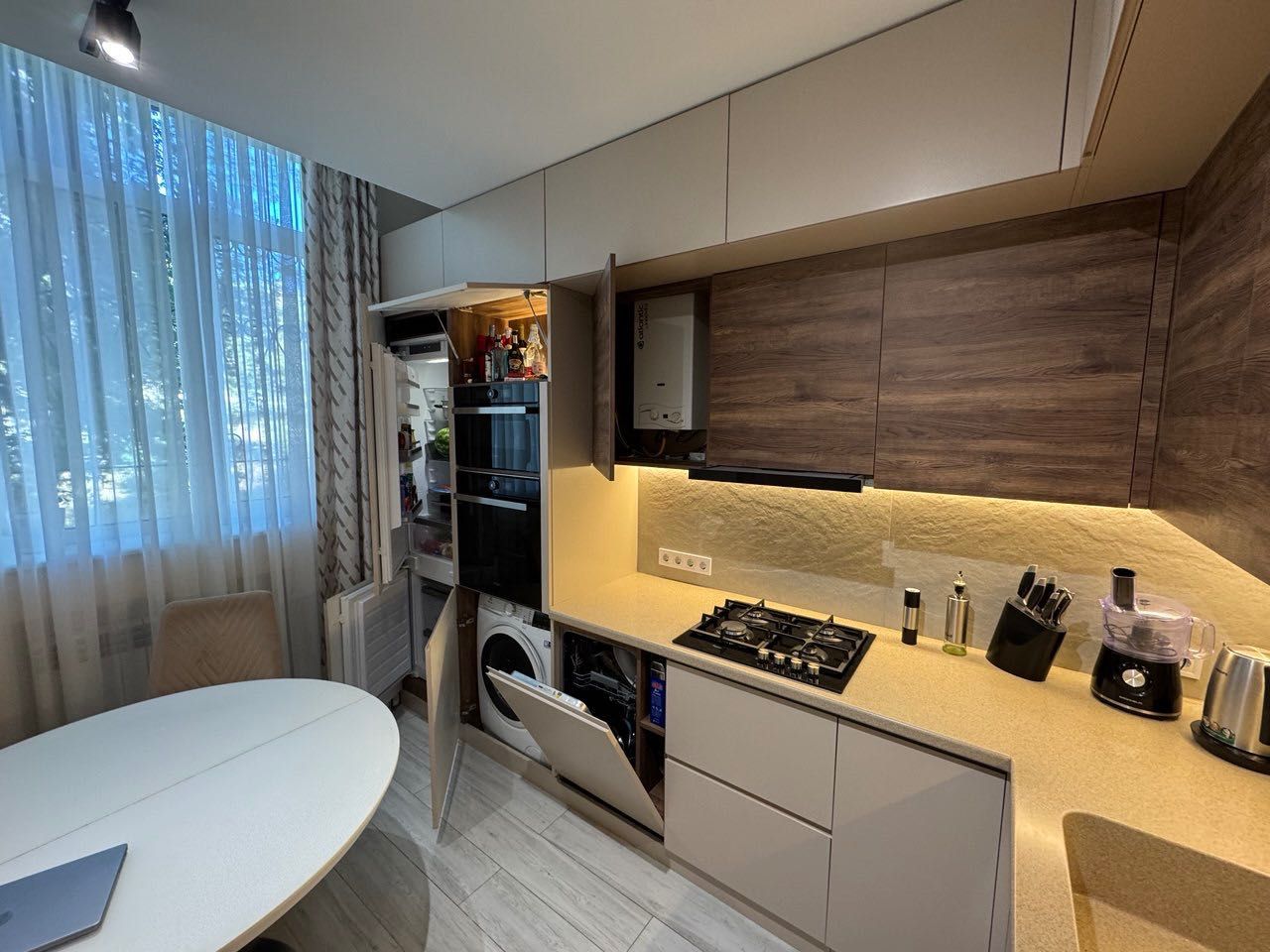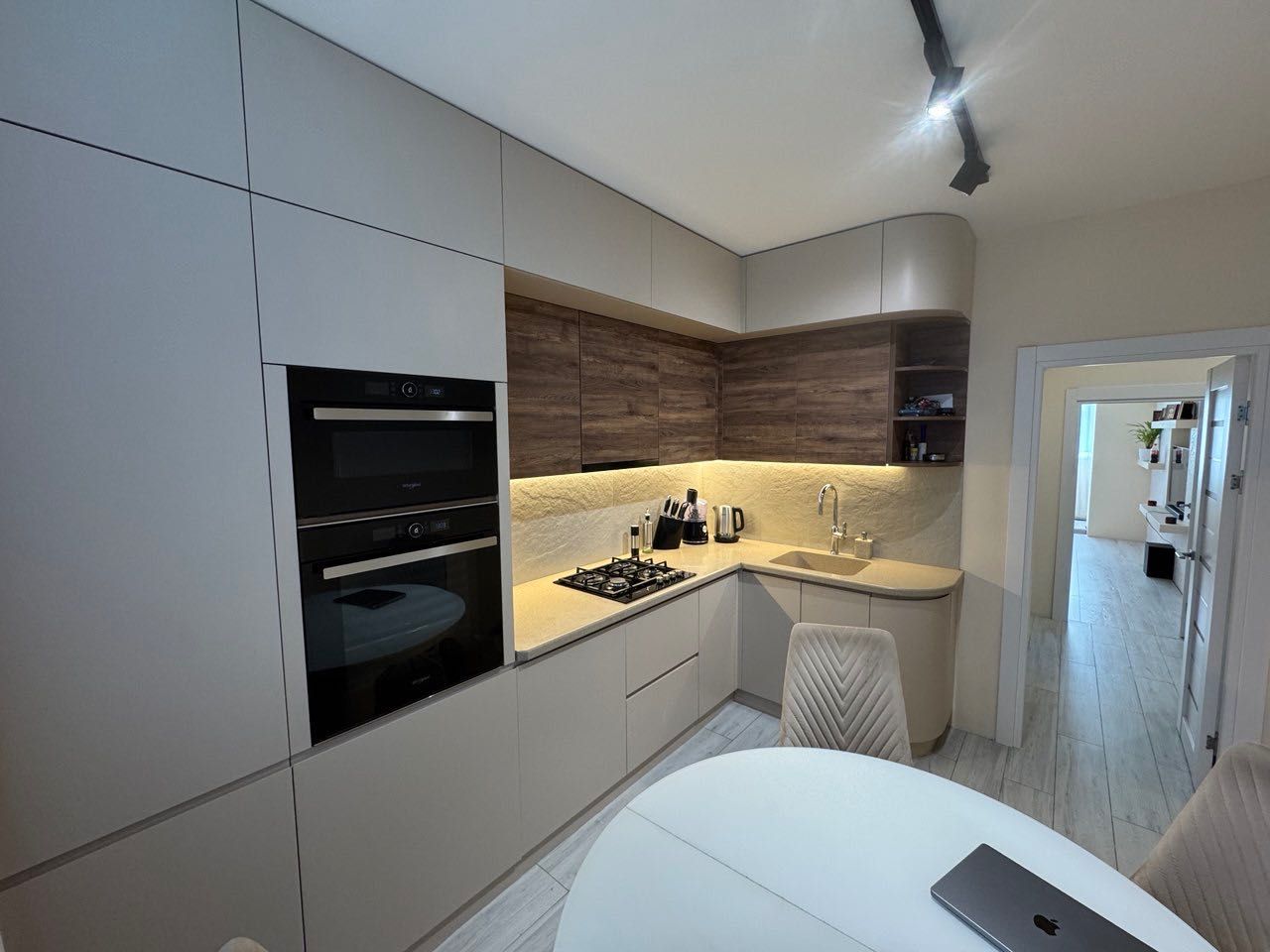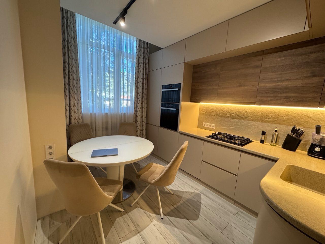 Всі меблі виготовлені на замовлення, оснащені фурнітурою BLUM з доводчиками, а фасади — фарбовані (не шпон), що свідчить про високу якість.