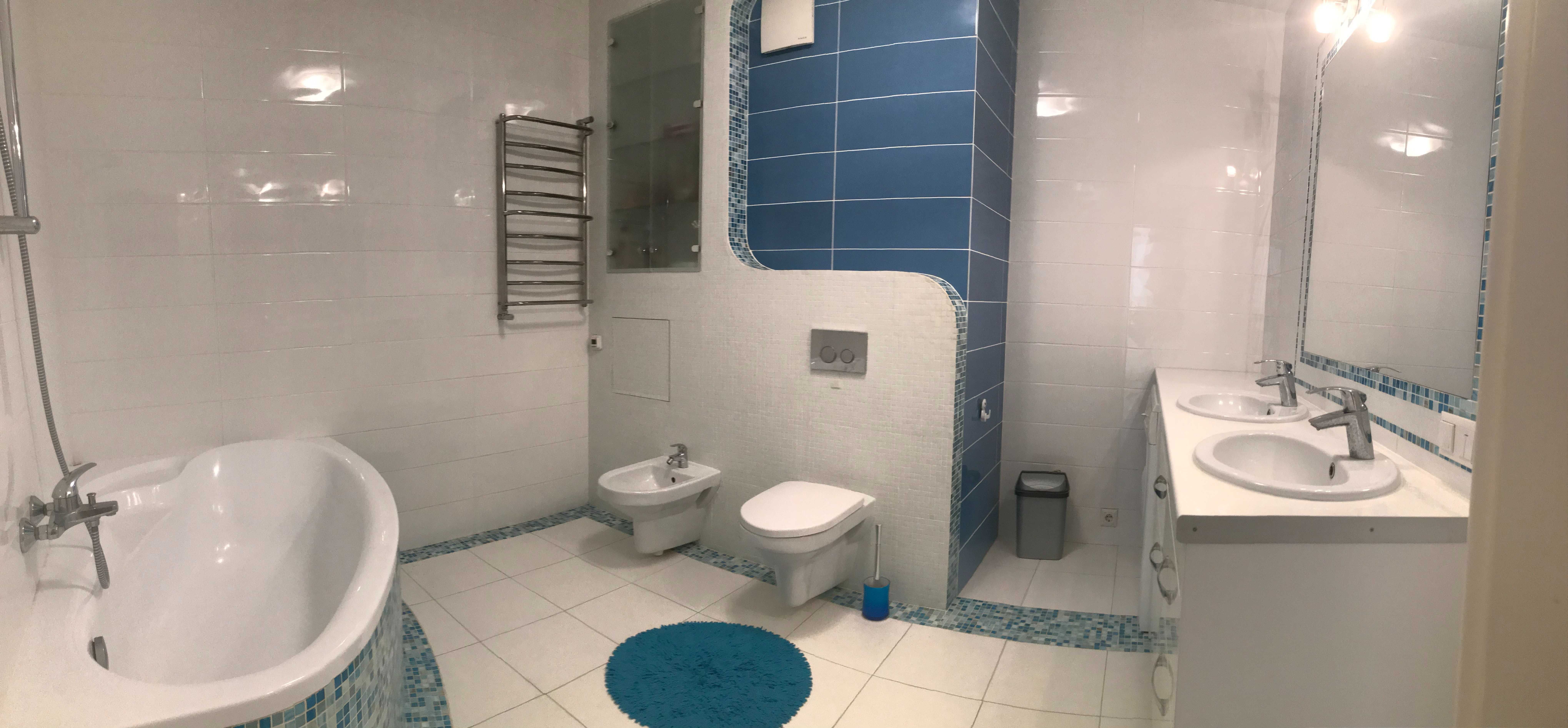 Квартира повністю укомплектована меблями та необхідною побутовою технікою. На підлозі укладена паркетна дошка «Канадський клен», у ванних кімнатах та на кухні — тепла підлога.