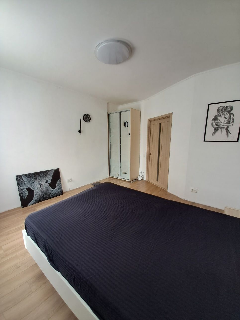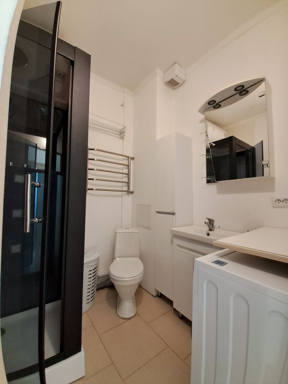 Суміжний санвузол обладнаний душовою кабіною, підлога — в плитці. Кухня повністю укомплектована, є холодильник. Меблі залишаються, що дозволяє одразу заселитися або здавати в оренду.