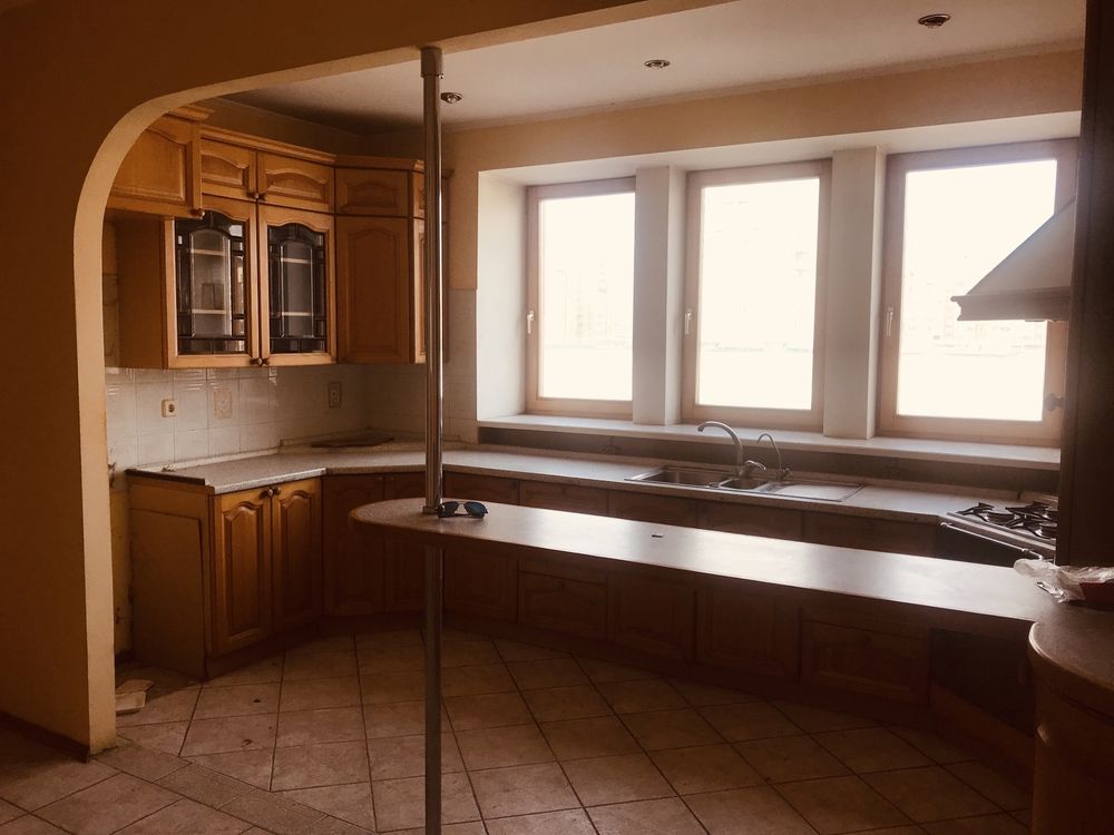 Квартира одноповерхова та займає половину поверху (на поверсі лише дві квартири). Вона має два санвузли та вражаючий вид на Дніпро з усіх вікон.