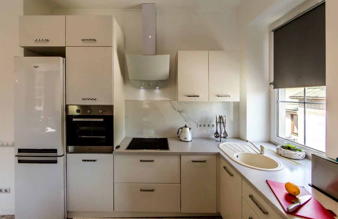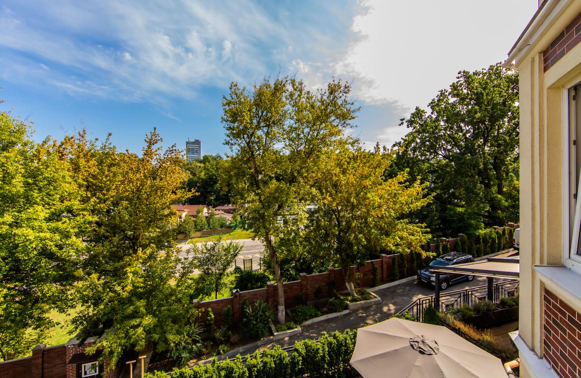 Інтер’єр доповнено стильними меблями, що створюють атмосферу затишку та елегантності. Вікна виходять у тихий внутрішній двір, де панує спокій і зелень.