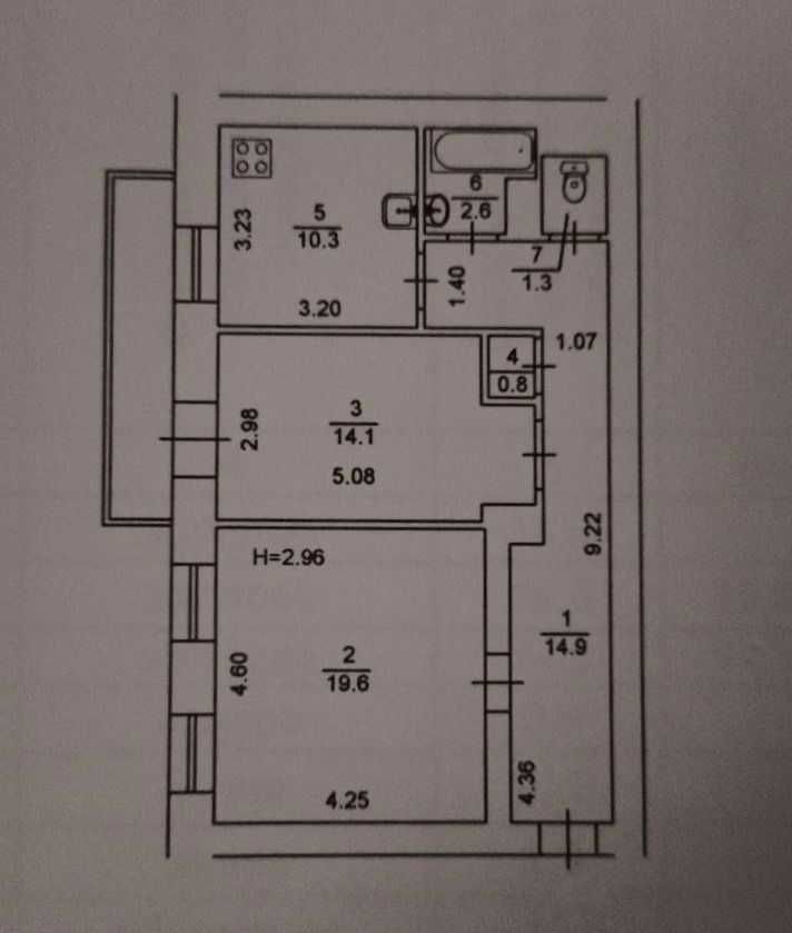 Загальна площа — 67,3 м², з роздільними кімнатами правильної форми, просторою кухнею (10,3 м²) та великою житловою зоною (34 м²). Високі стелі — 2,96 м — додають об’єму, а автентичний паркет, який можна відновити, зберігає характер і тепло.