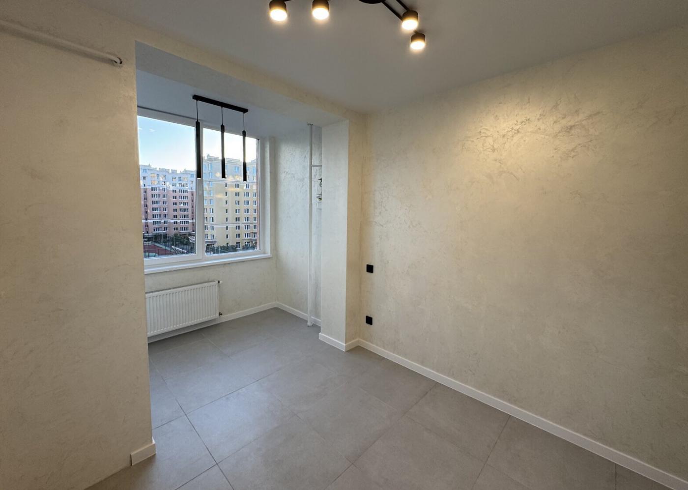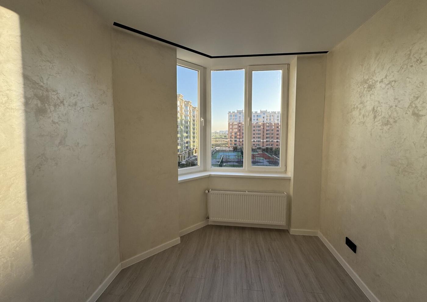 Сучасний інтер'єр доповнюють МДФ-плінтус та МДФ-панелі на стіні. Квартира без меблів, але повністю готова до заселення, що робить її ідеальним варіантом як для життя, так і для інвестиції. З вікон відкривається вид не у будинок, а на затишний та дуже просторий дитячий майданчик.