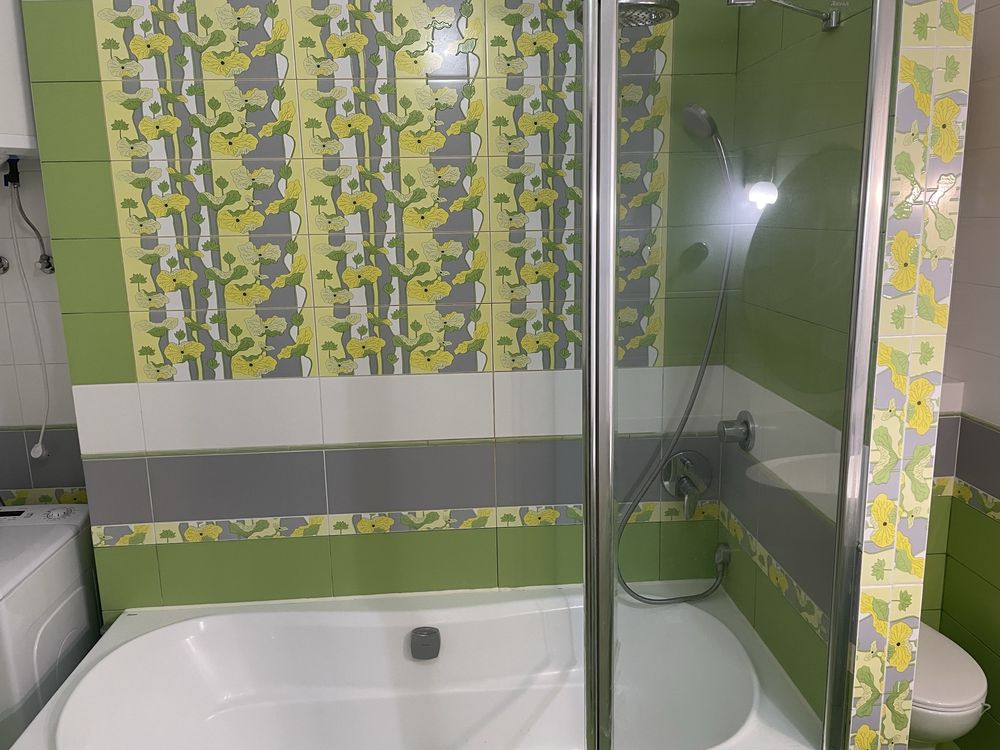 Кухня, де підлога встелена плиткою, має вихід на балкон та оснащена всією необхідною комплектацією. Значною перевагою є наявність двох санвузлів, один з яких обладнаний як ванною, так і душовою.