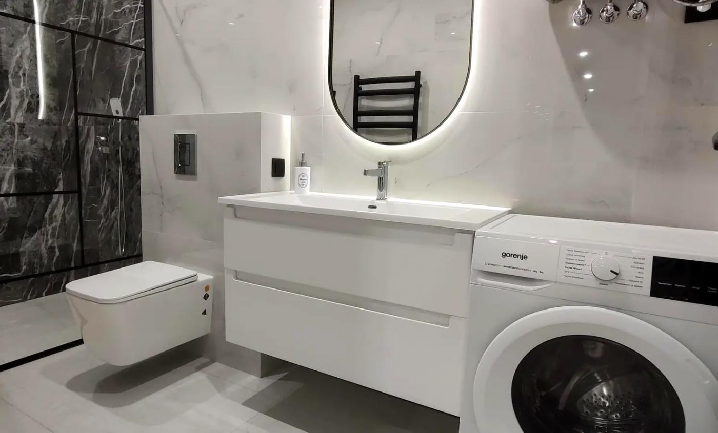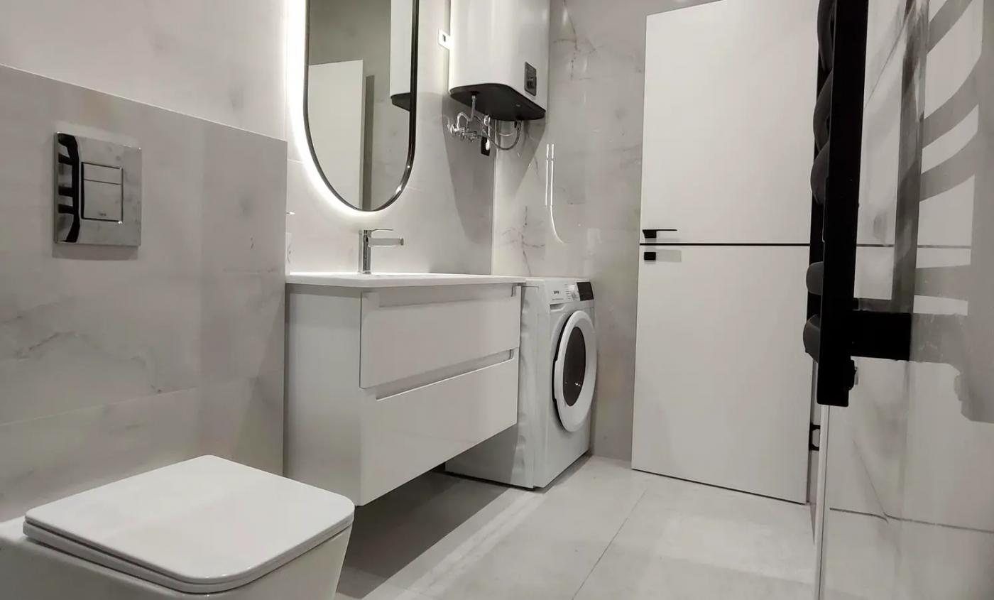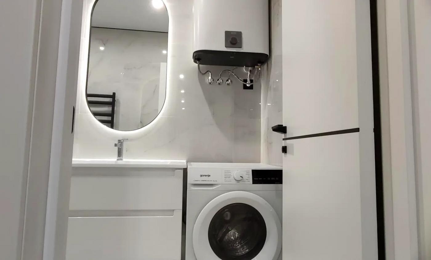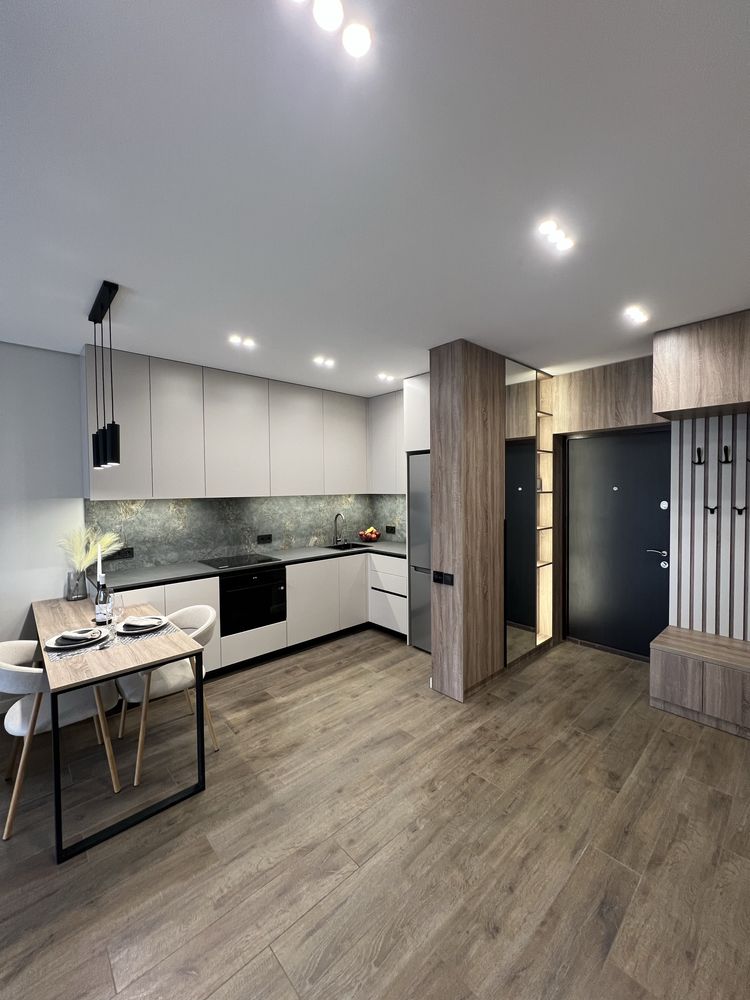 В наявності великий телевізор 50 дюймів, інверторний кондиціонер (тепло/холод), прально-сушильна машина та інша якісна техніка. Меблі — вбудовані, виконані на замовлення.