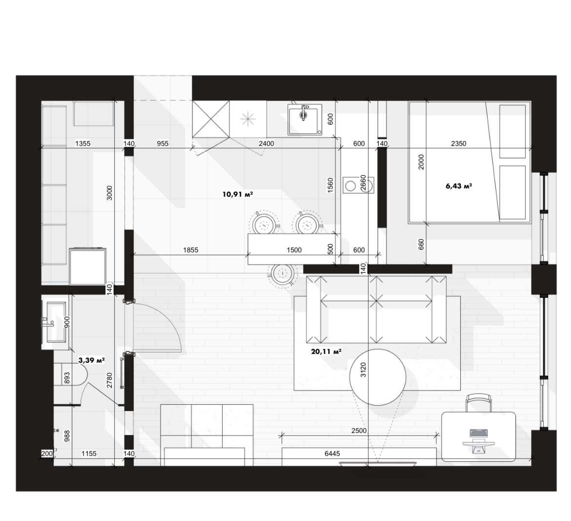 У квартирі встановлені двоє міжкімнатних дверей прихованого монтажу від «Holz» та скляна металева перегородка «Zeist» з функцією дотягування, яка відділяє спальню від кухні-вітальні.