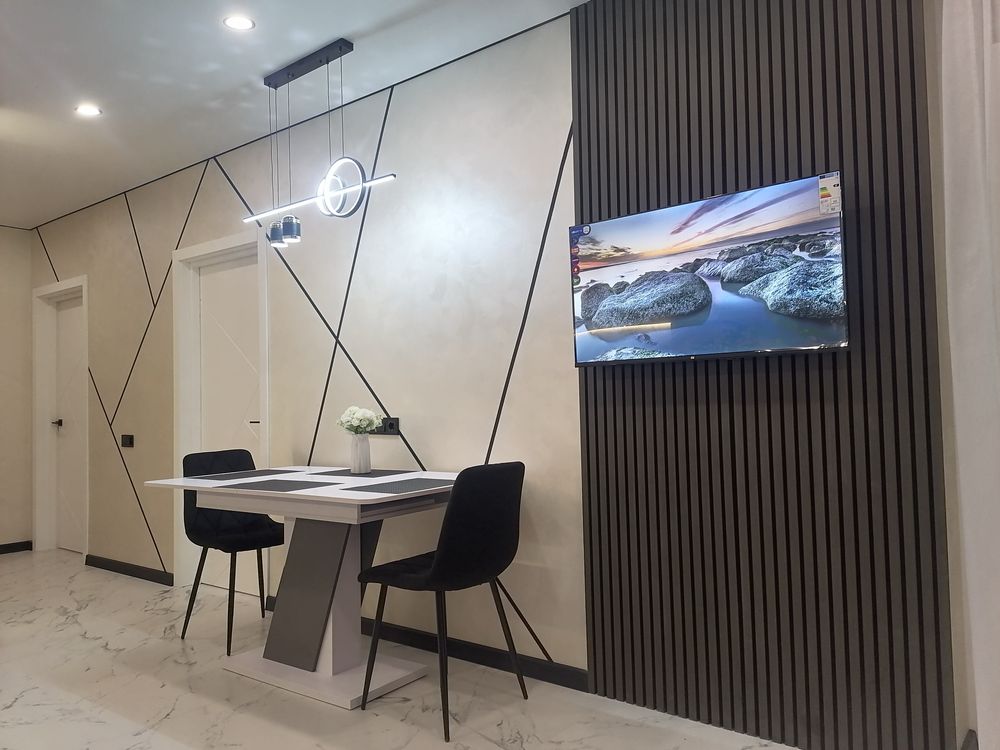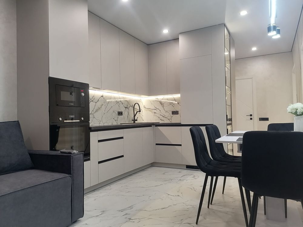 Житло має новий якісний ремонт, виконаний у сучасному стилі з використанням декоративної штукатурки на стінах. Дві окремі кімнати повністю мебльовані, кухня-вітальня облаштована зоною відпочинку.