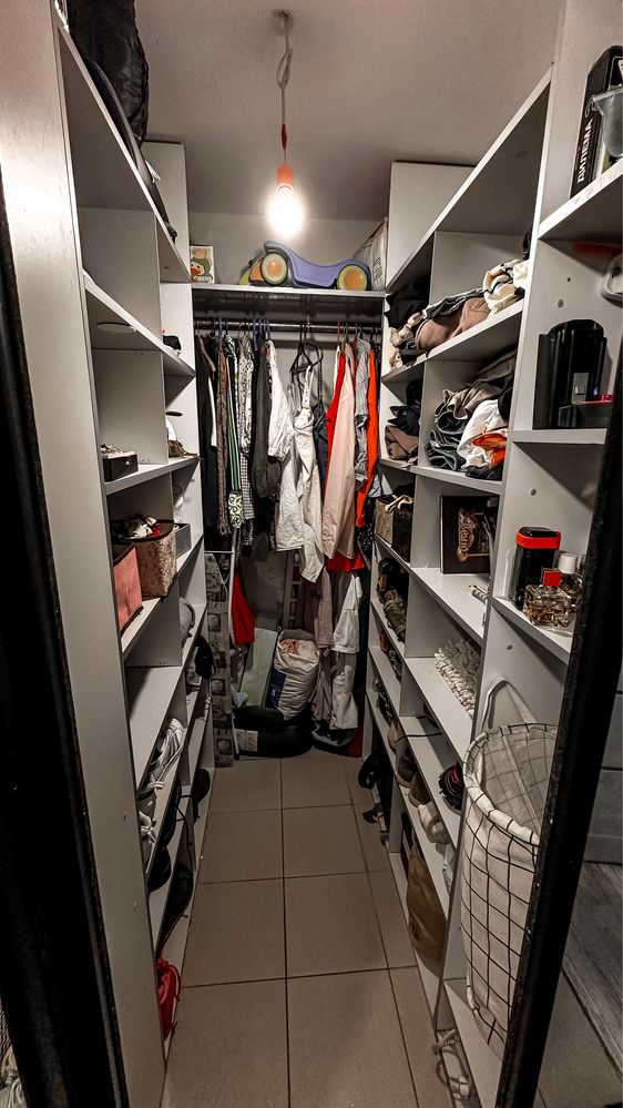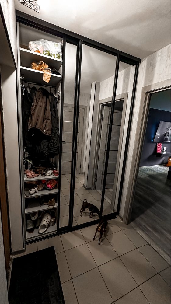 Окрема простора гардеробна кімната з дзеркальними дверима та шафою для щоденного одягу.