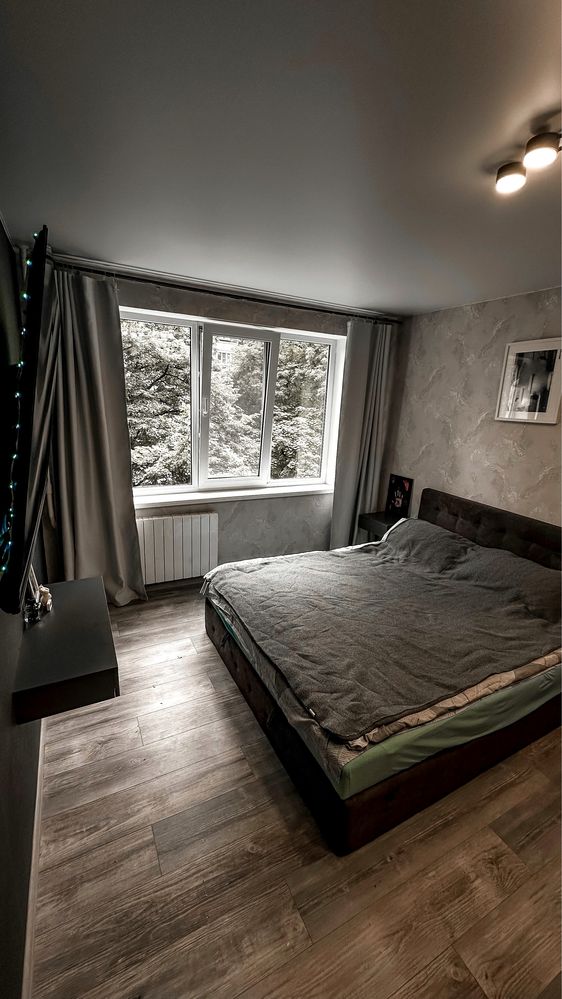 У спальні — двоспальне ліжко 180х200 з новим ортопедичним матрацом в ідеальному стані. Встановлені розетки «Videx» з USB-входами.