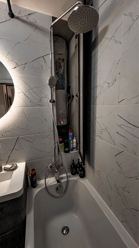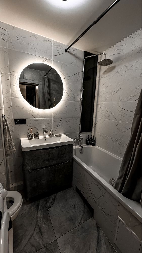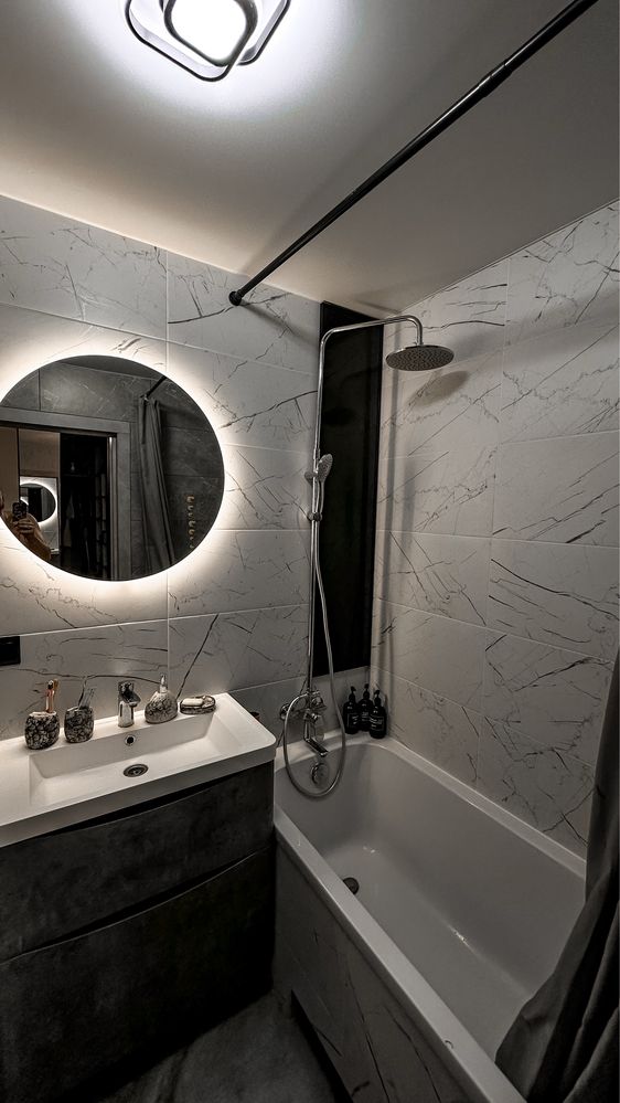 У ванній кімнаті — інсталяція «Geberit», тропічний душ, захований бойлер, електрична рушникосушка з регулюванням температури, а сантехніка — лише брендові рішення. У кімнаті та ванній кімнаті — натяжні стелі, а гаряча вода є весь рік.