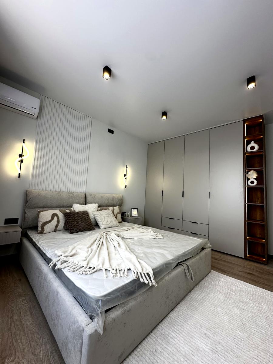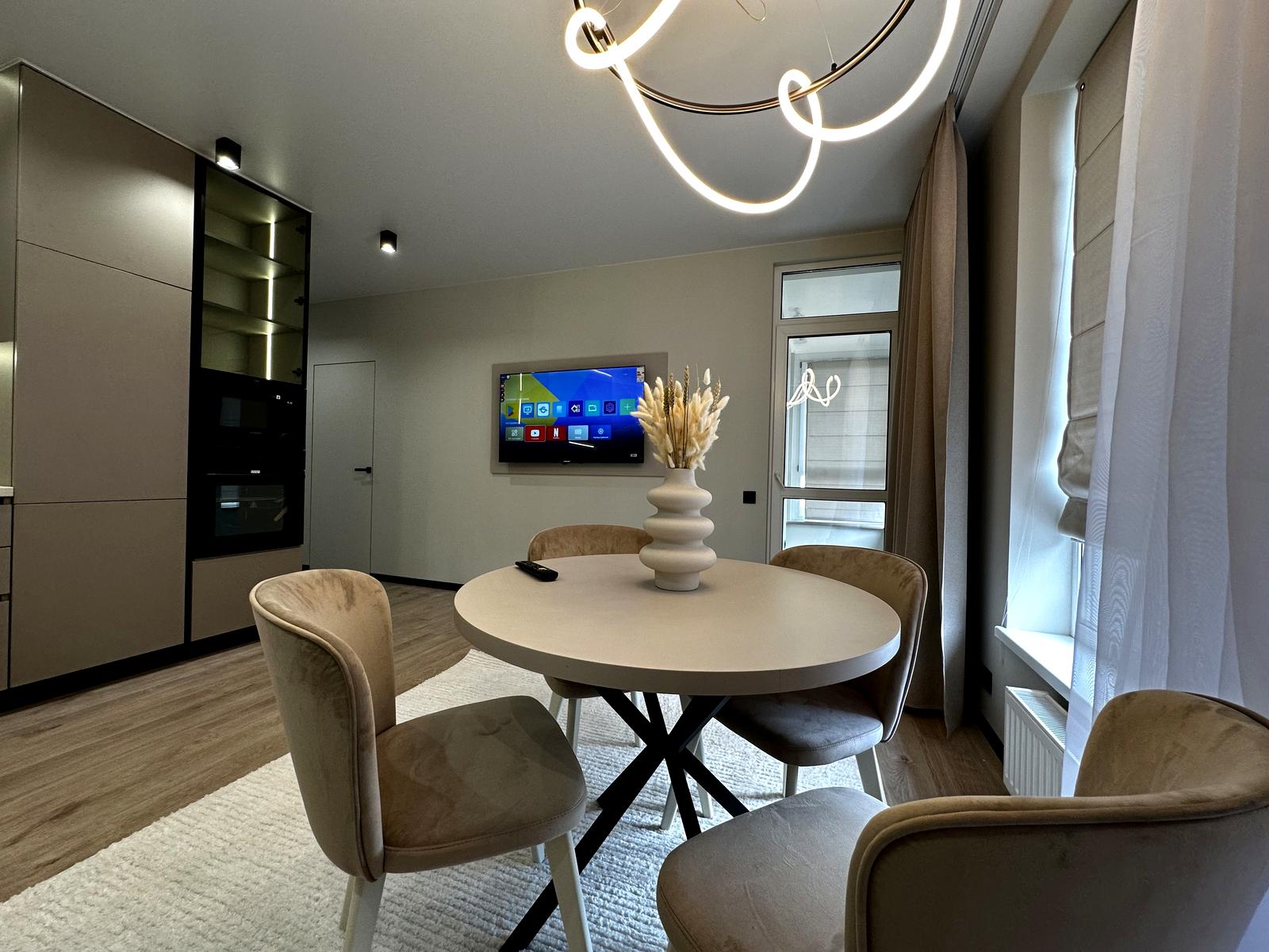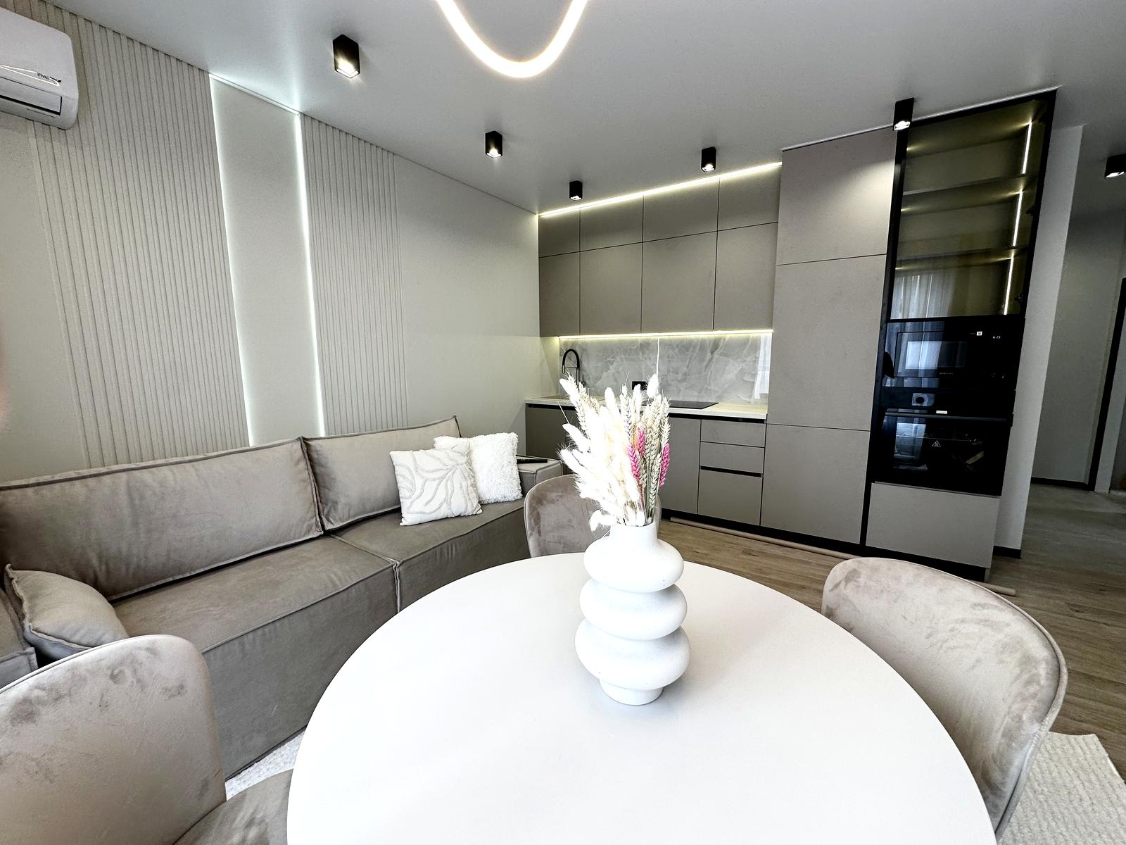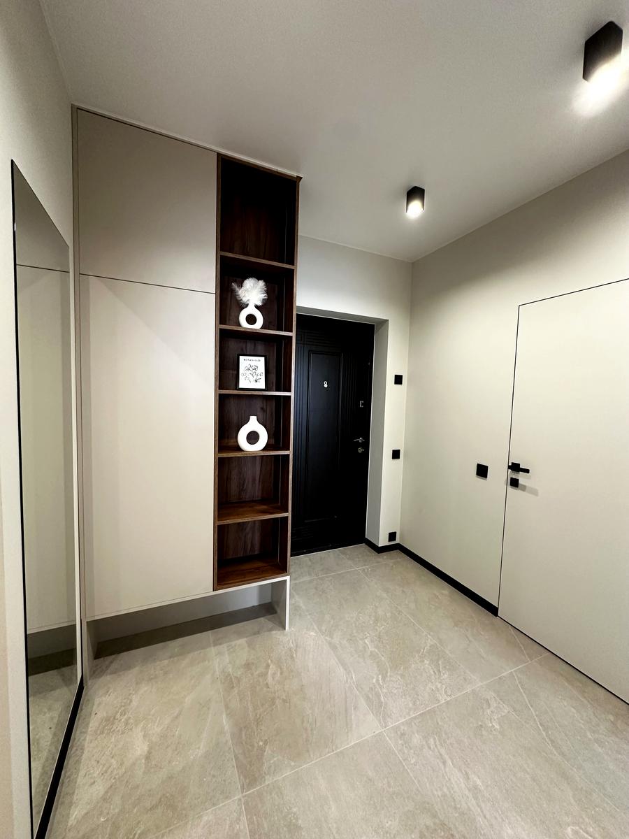 У помешканні щойно завершено сучасний ремонт, виконаний у нейтральній колірній гамі.