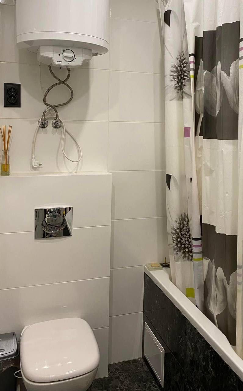 Оселя у гарному стані, з продуманим плануванням. На підлозі — ламінат, санвузол з ванною — облицьований плиткою. Панорамні вікна у спальні відкривають краєвид на місто, додаючи світла та глибини простору.