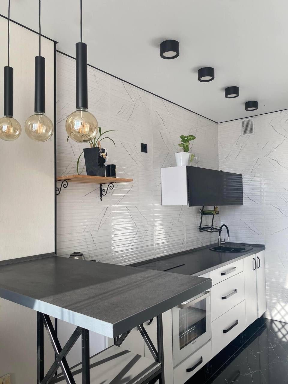 Кухня функціональна, повністю укомплектована, є всі необхідні меблі та сучасна техніка — житло готове до заселення без додаткових витрат.
