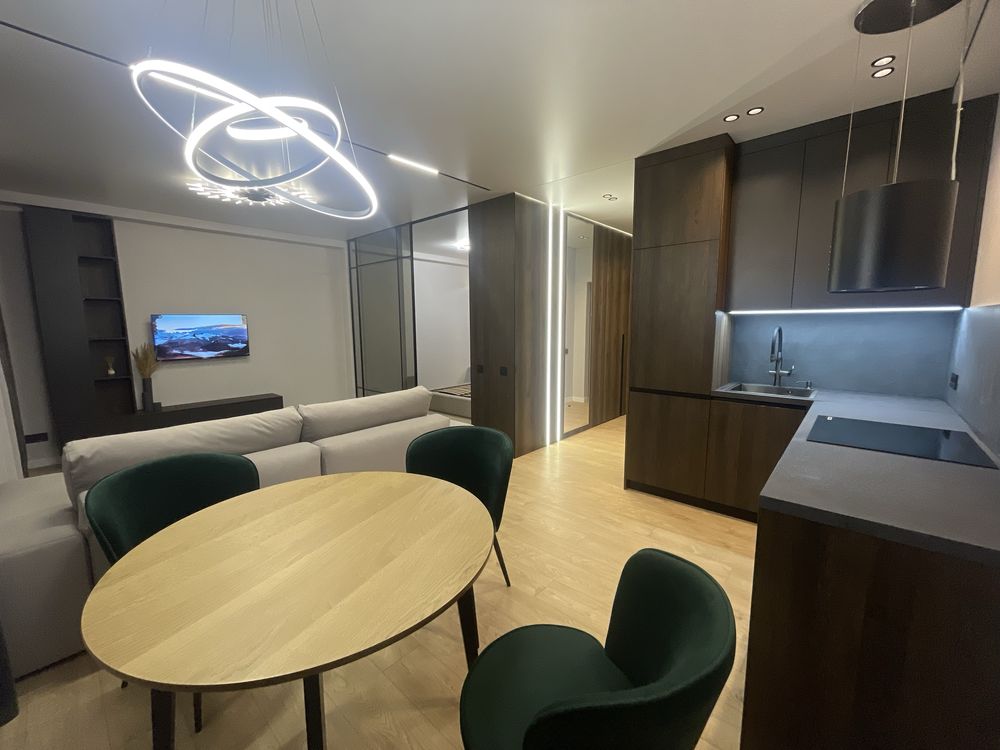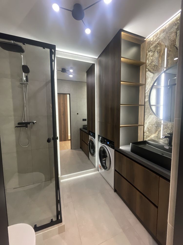 Простір повністю мебльований і укомплектований технікою: варочна панель, духова шафа, телевізор, пральна машина, бойлер, кондиціонер — усе готове для комфортного проживання.