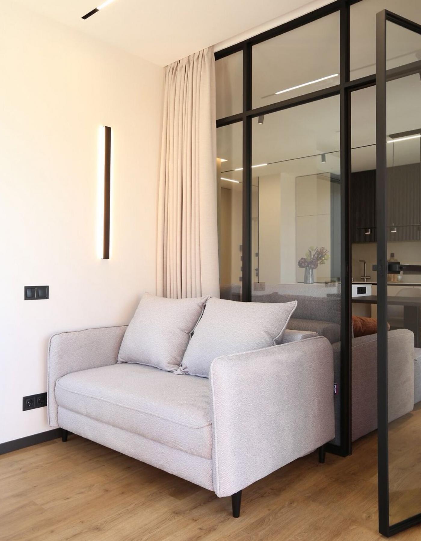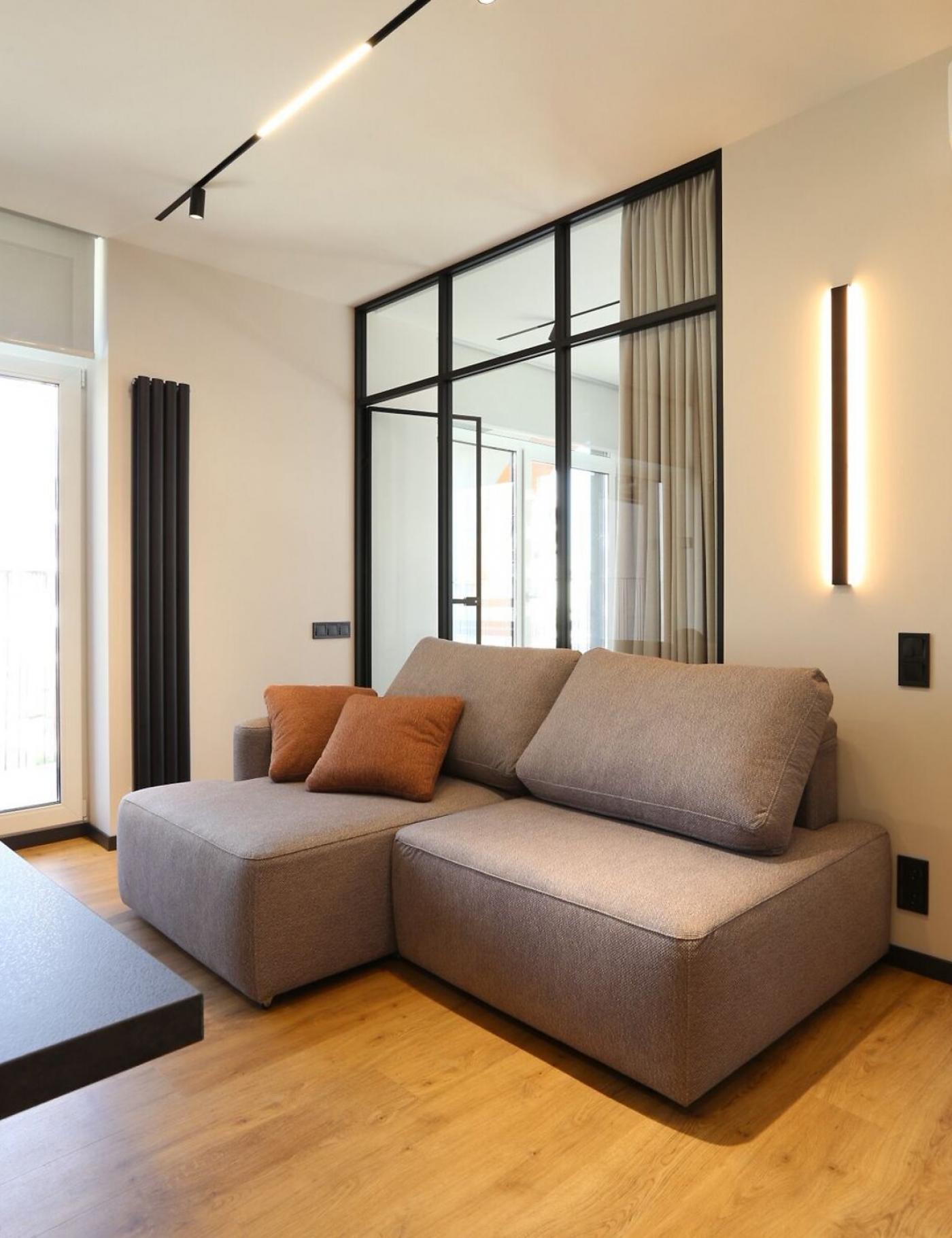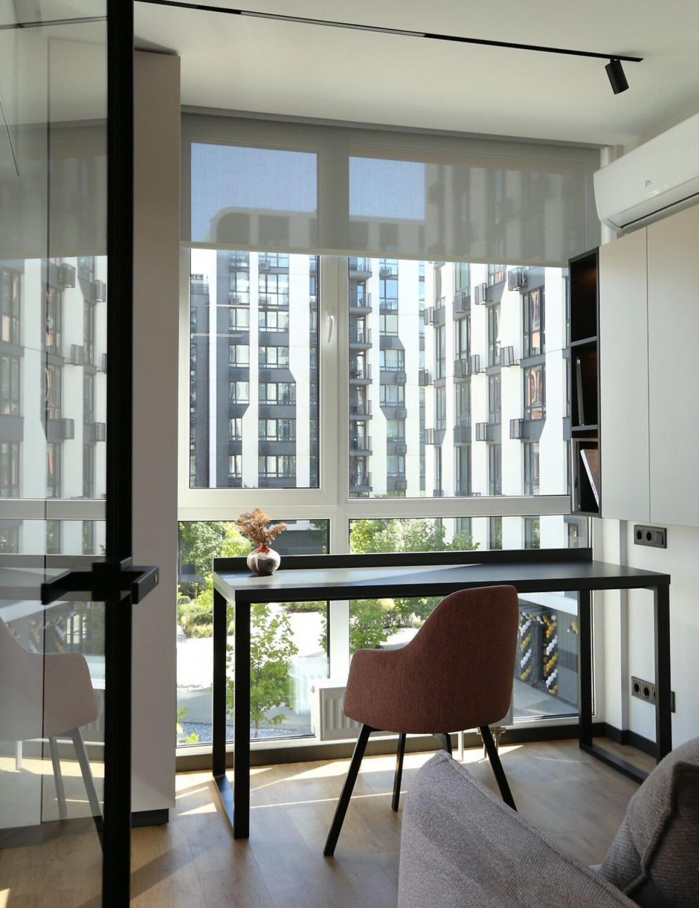 Це помешкання площею 57 м2 (51 м2 з урахуванням коефіцієнта на терасу) має функціональне планування 2 1: кухня-їдальня, спальня та кабінет/дитяча кімната.