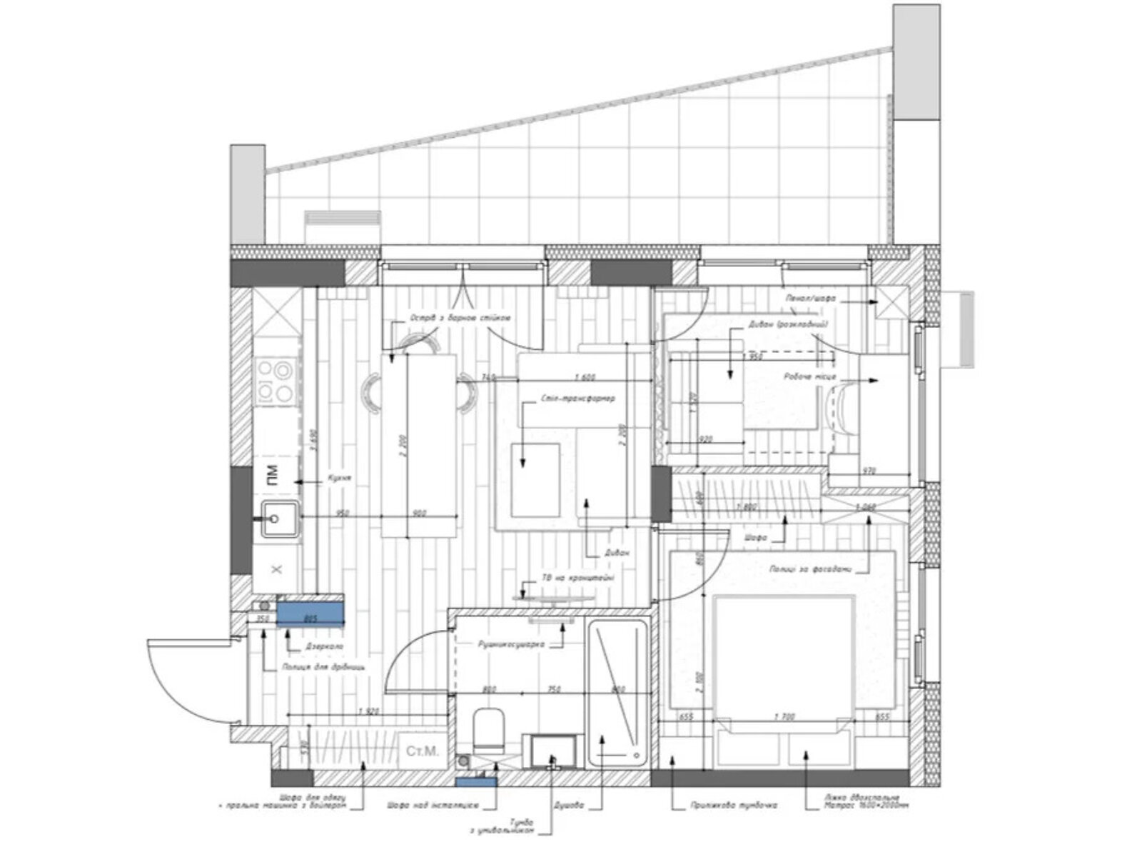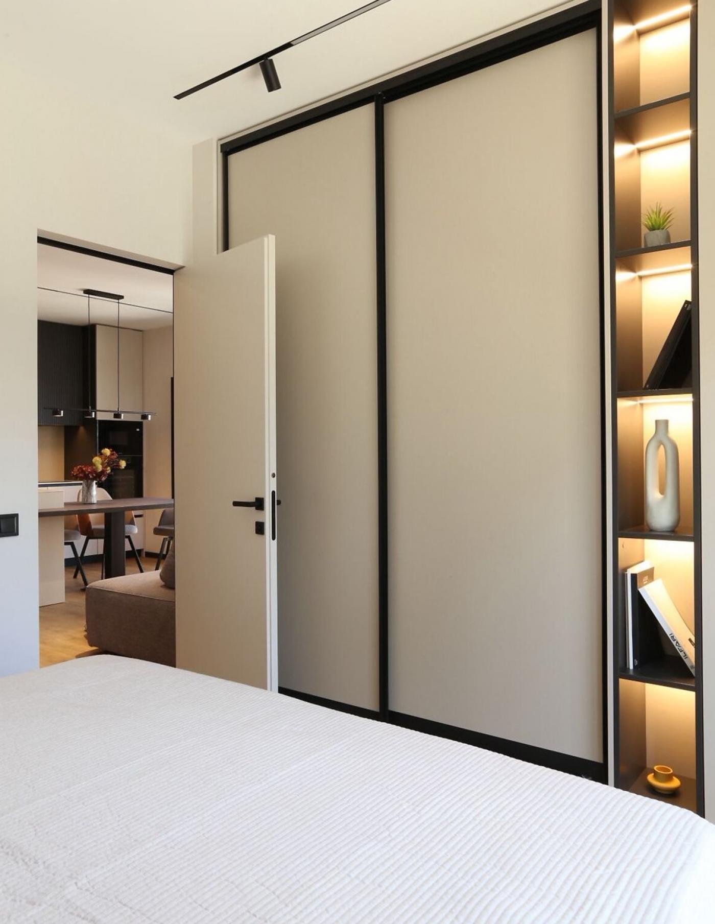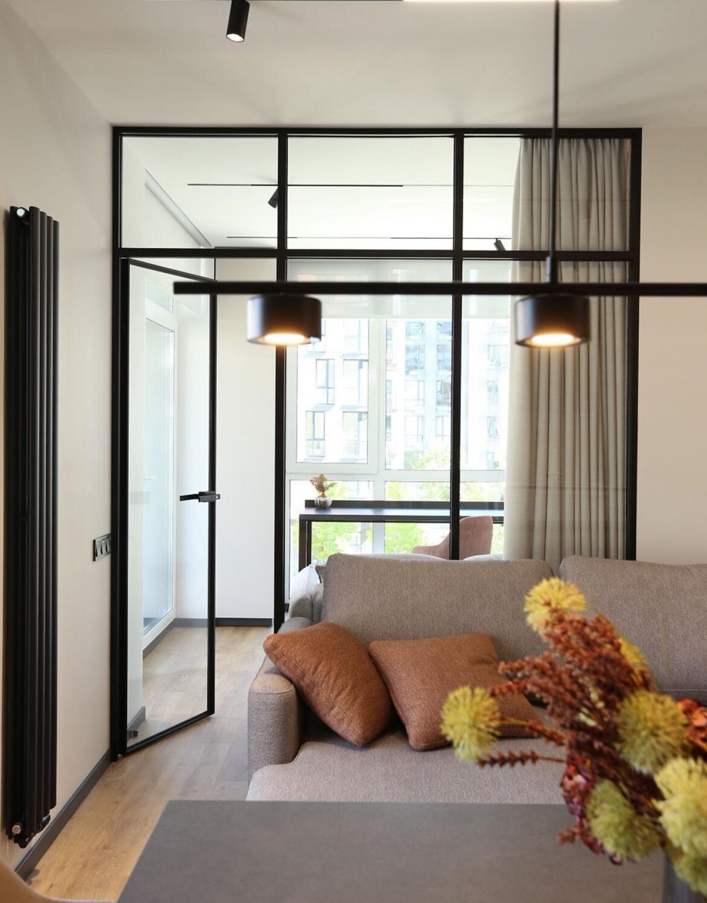 Це помешкання площею 57 м2 (51 м2 з урахуванням коефіцієнта на терасу) має функціональне планування 2 1: кухня-їдальня, спальня та кабінет/дитяча кімната.